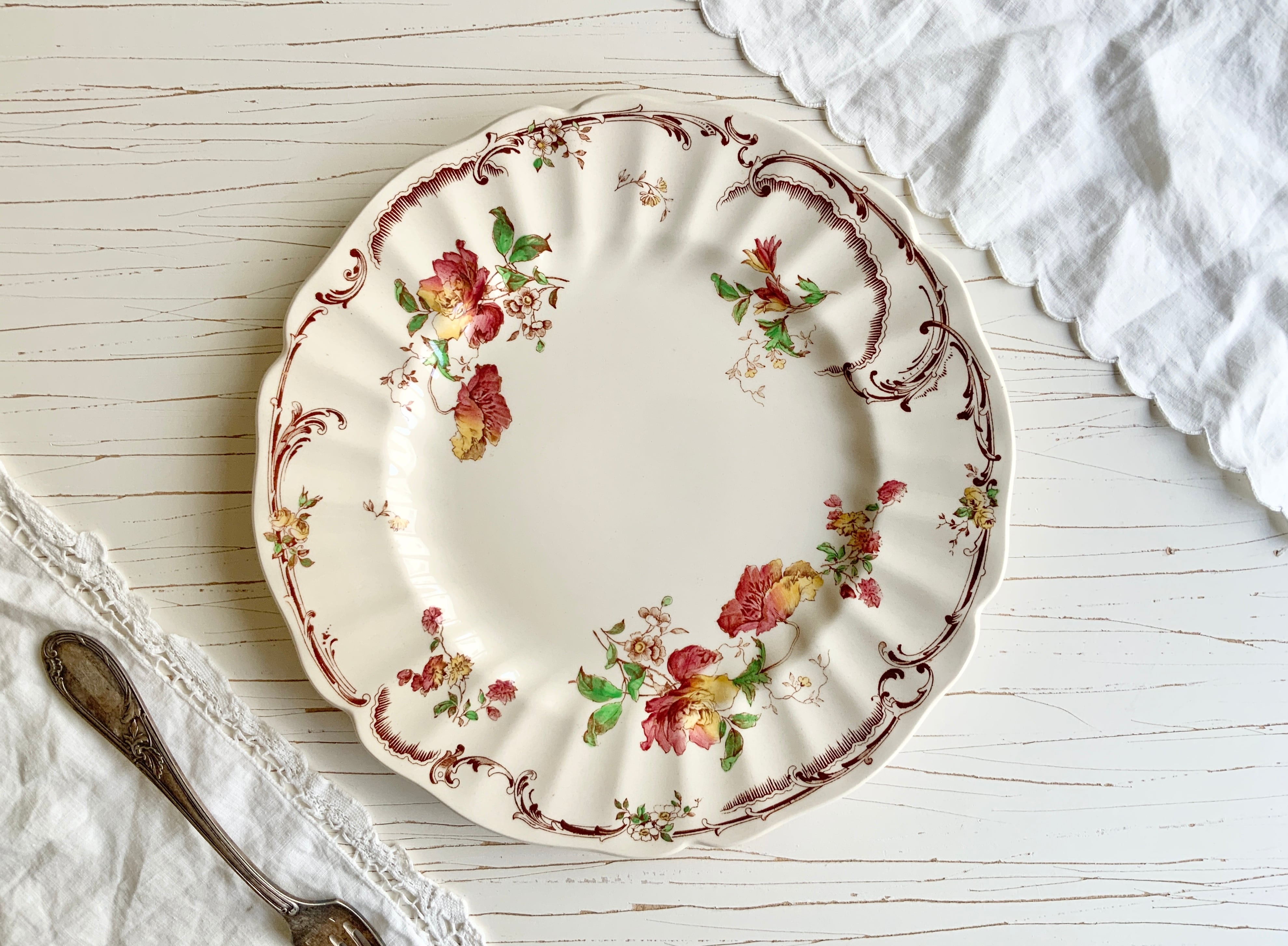 ゆるやかに波打つフラワーリムに、落ち着いたブラウンでロカイユと美しいバラが描かれ、ところどころにマーガレットや小さな小花が添えられています。