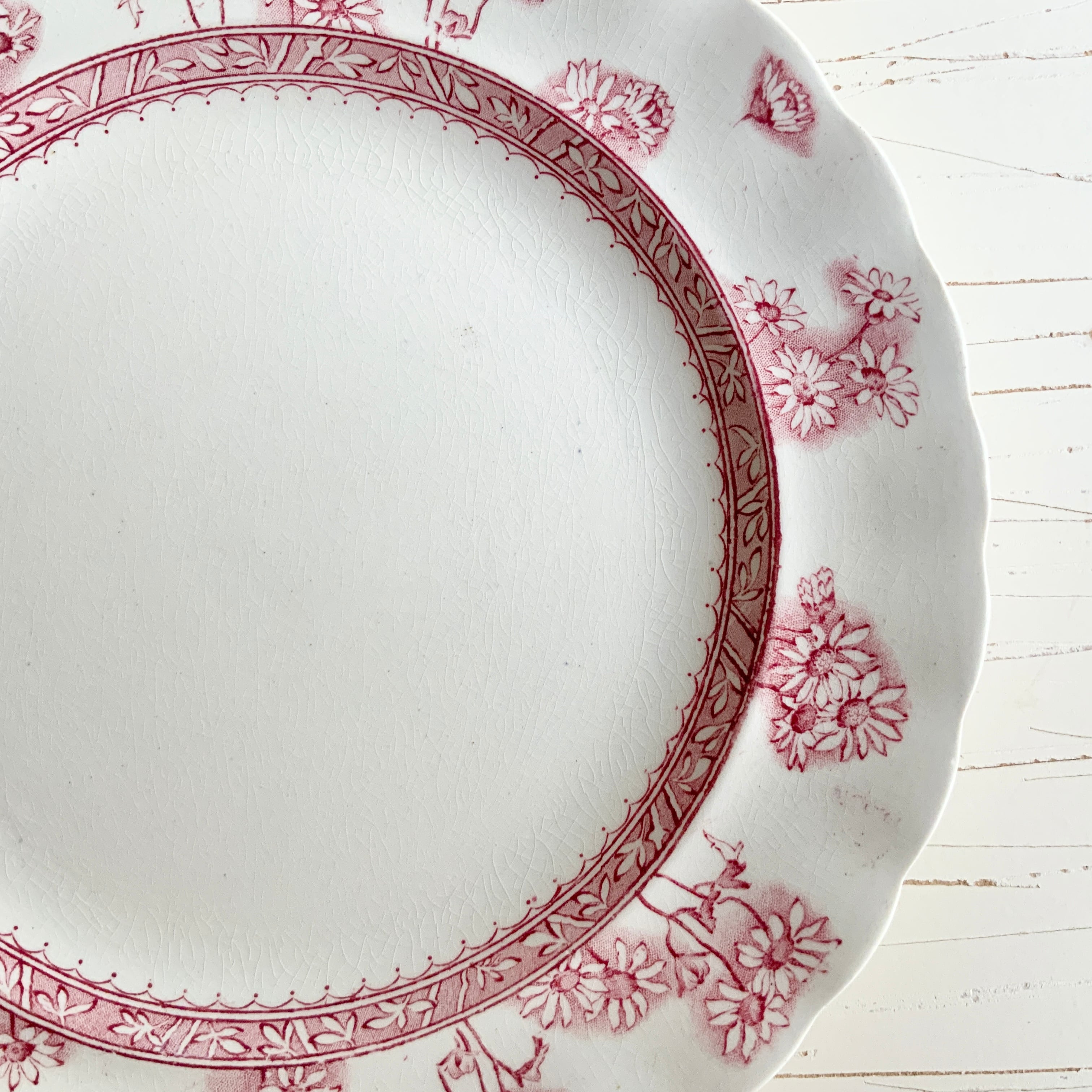 ピンクがかった赤色で愛らしいデイジーが縁いっぱいに描かれており、