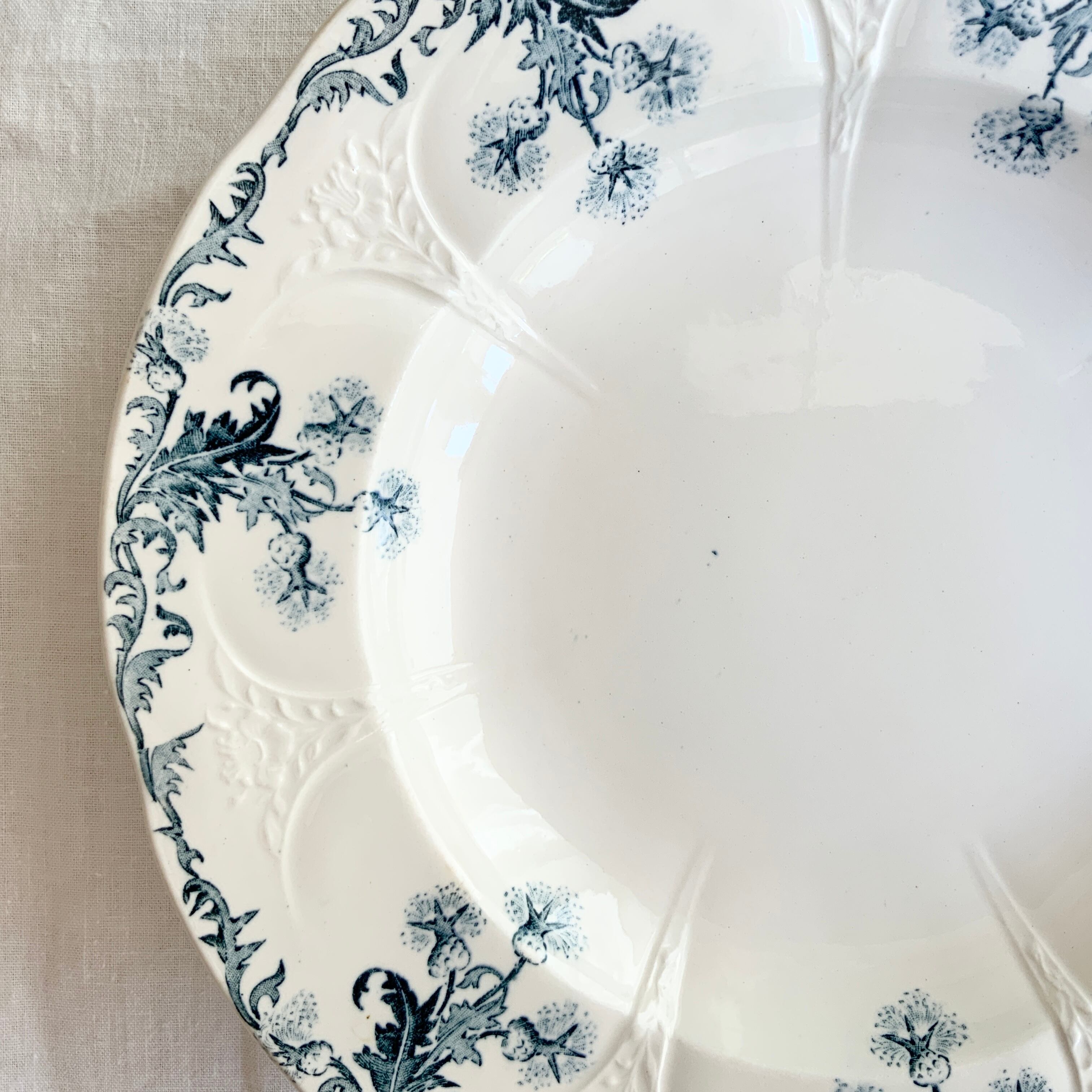 やわらかな白地に、ブルーがかったグリーンでアザミが描かれ、アザミの葉の部分はロカイユになっています。