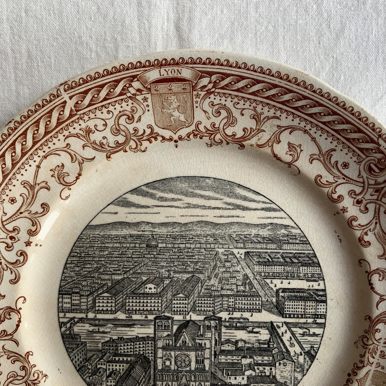 こちらのプレートのモチーフはリヨンの古い町並み。丘の町であるリヨンを高台から見下ろした風景が、サン・ジャン広場のリヨン大聖堂を中心に全体が美しく描かれています。