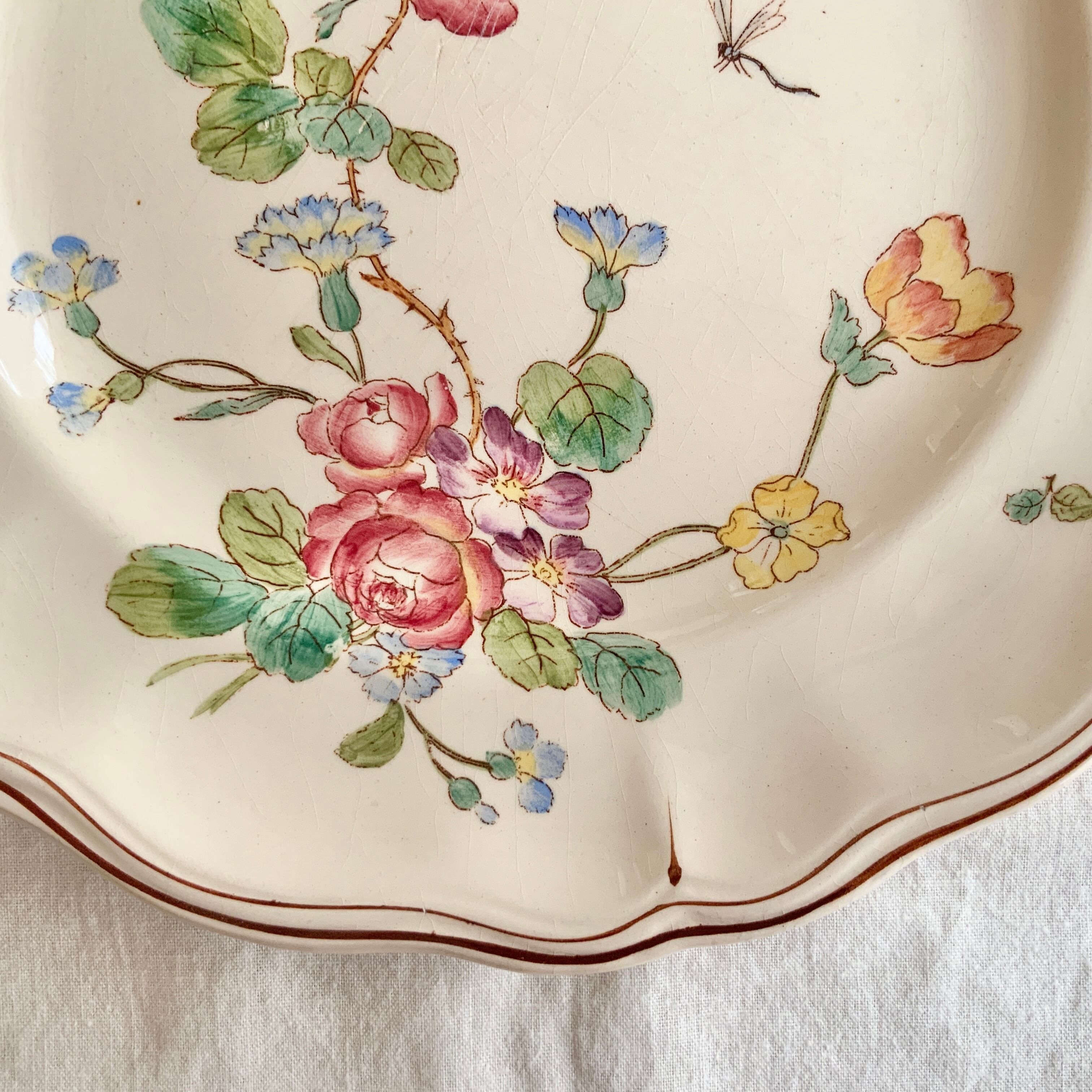 やわらかいベージュの色味に、ブラウンでバラやチューリップ、カーネーションや勿忘草などの美しい花々と、ブルーの糸とんぼが描かれています。