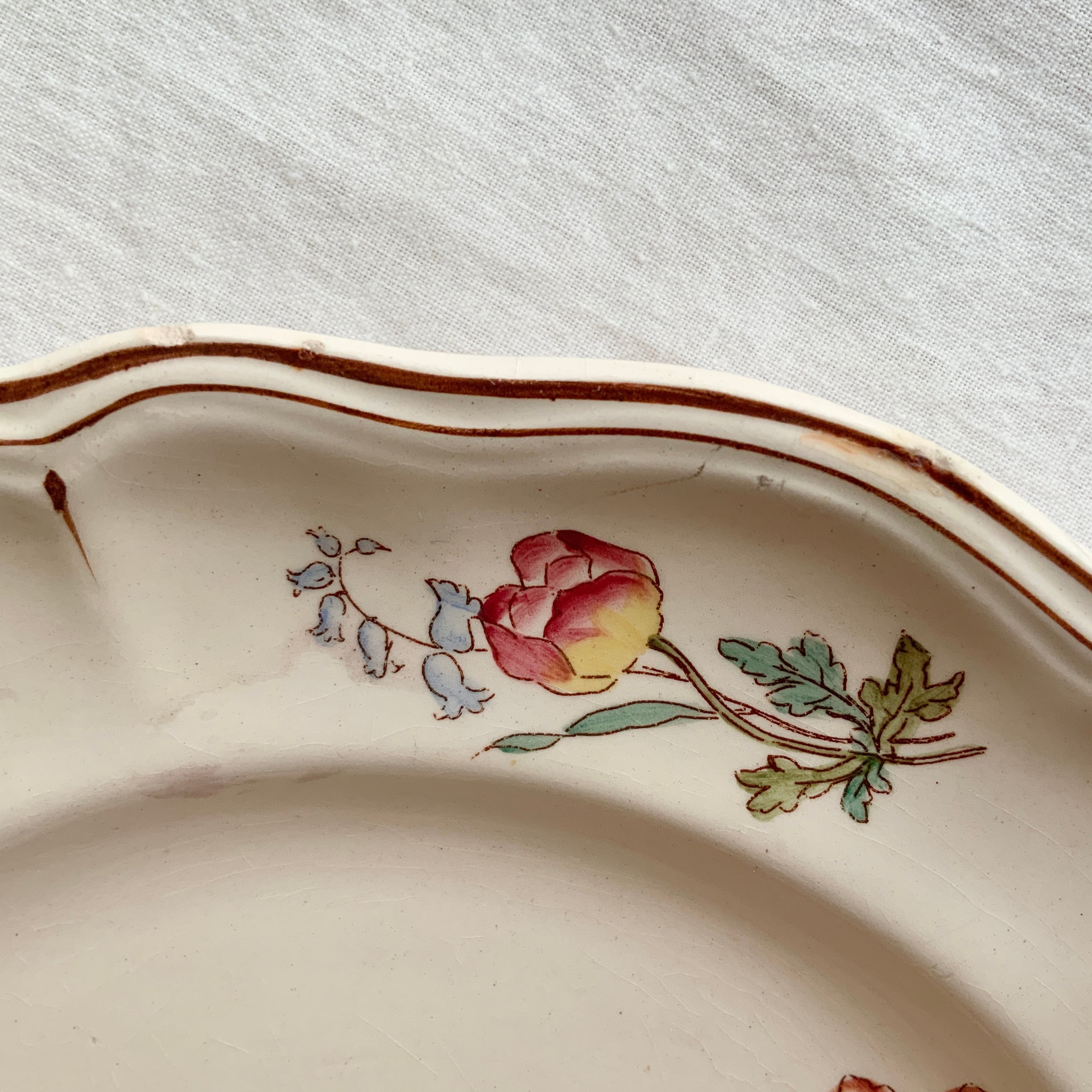 フラワーリムの縁には落ち着いたブラウンのダブルラインと、可愛く小さな葉っぱが散らされています。