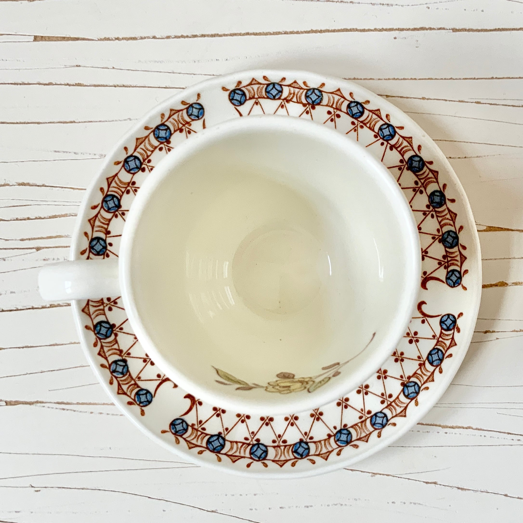やさしいクリーム色に、ブラウンと薄いブルーやイエローで可愛らしい小花が、縁には美しいラティス模様が描かれています。