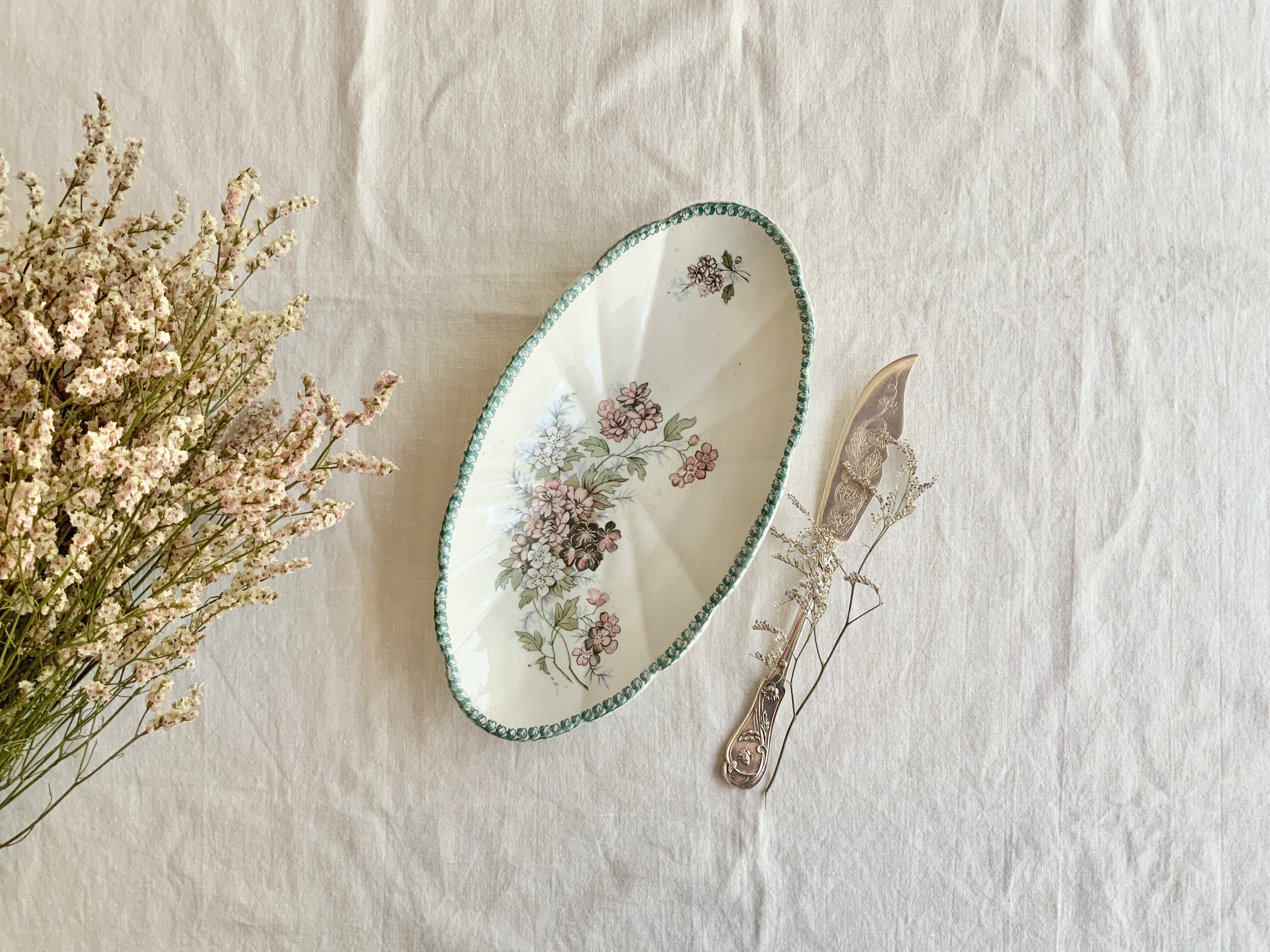 繊細なパステルカラーのピンクや、グリーンブルーで愛らしい野バラが描かれています。縁には葉っぱ模様が施され、とても美しい一枚です。