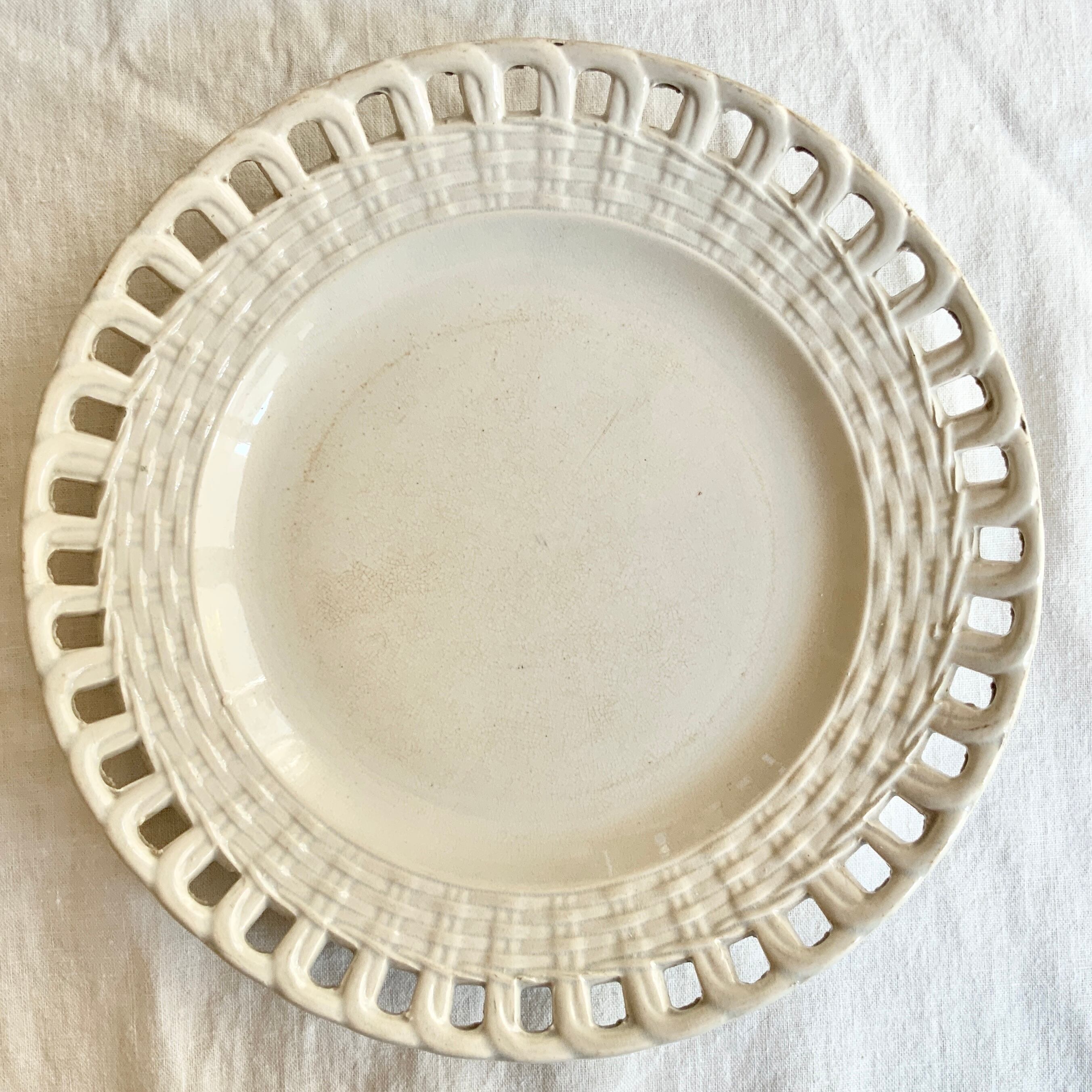 Creil et Montereauらしい白地にパニエの模様と、透かし彫りの装飾が施された美しい一枚です。