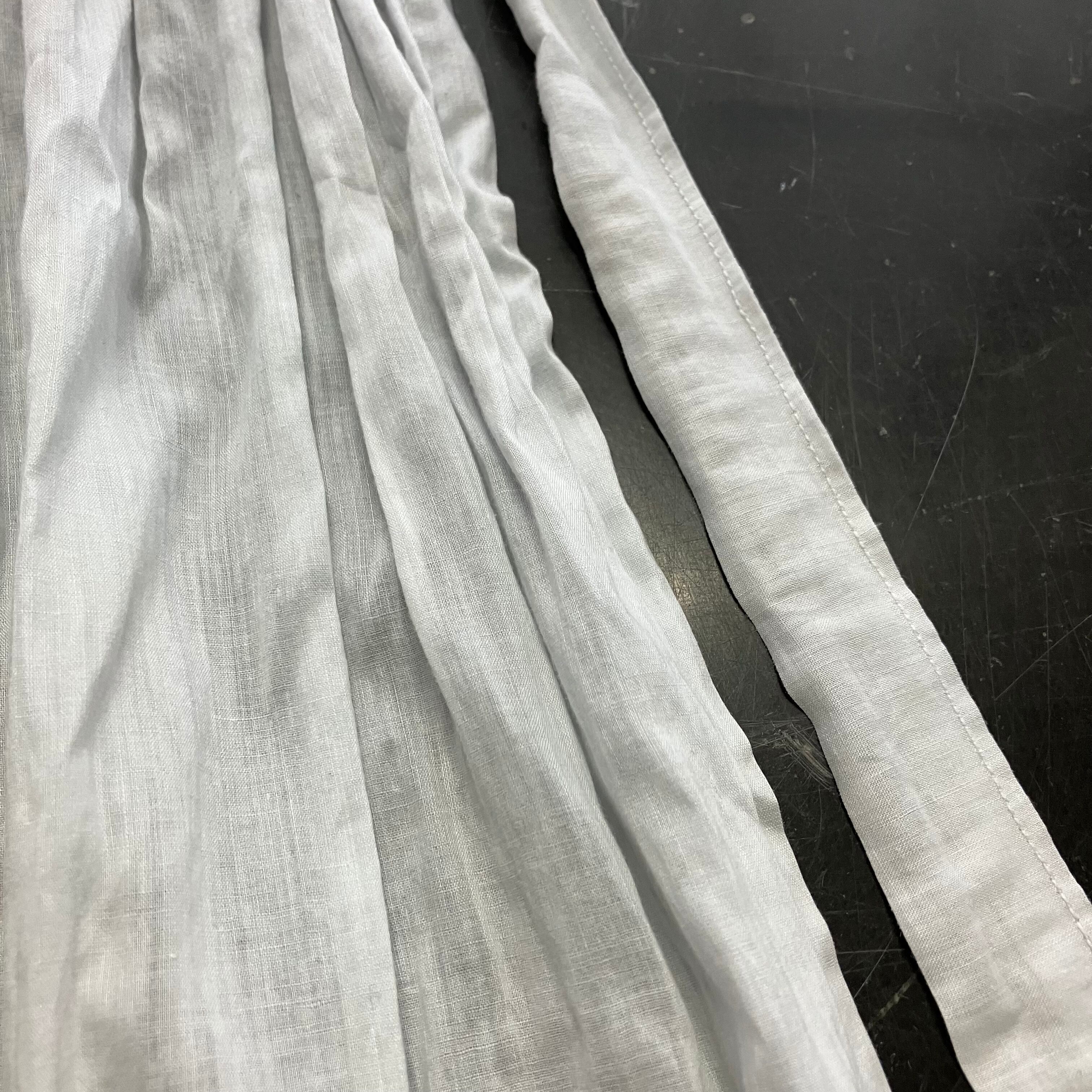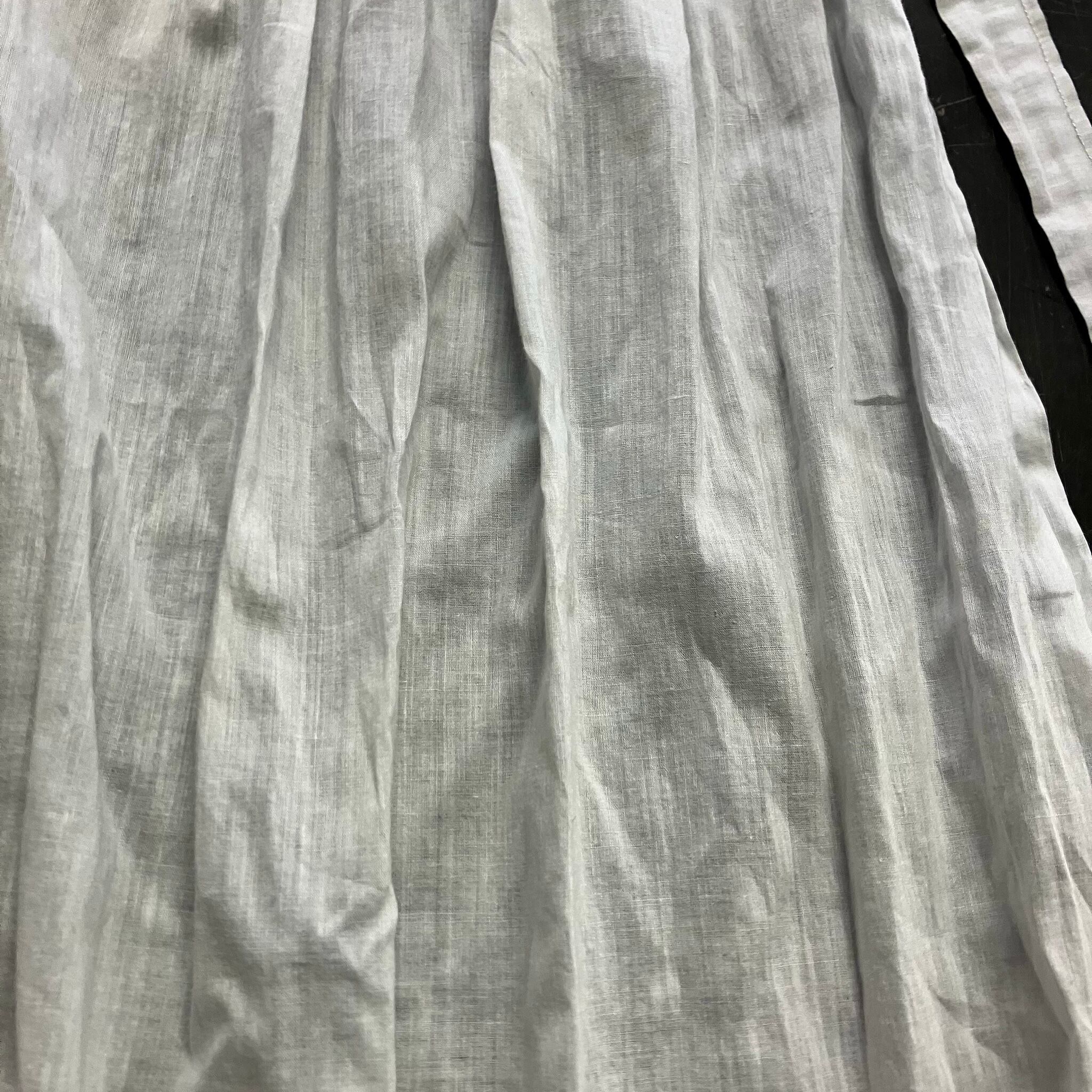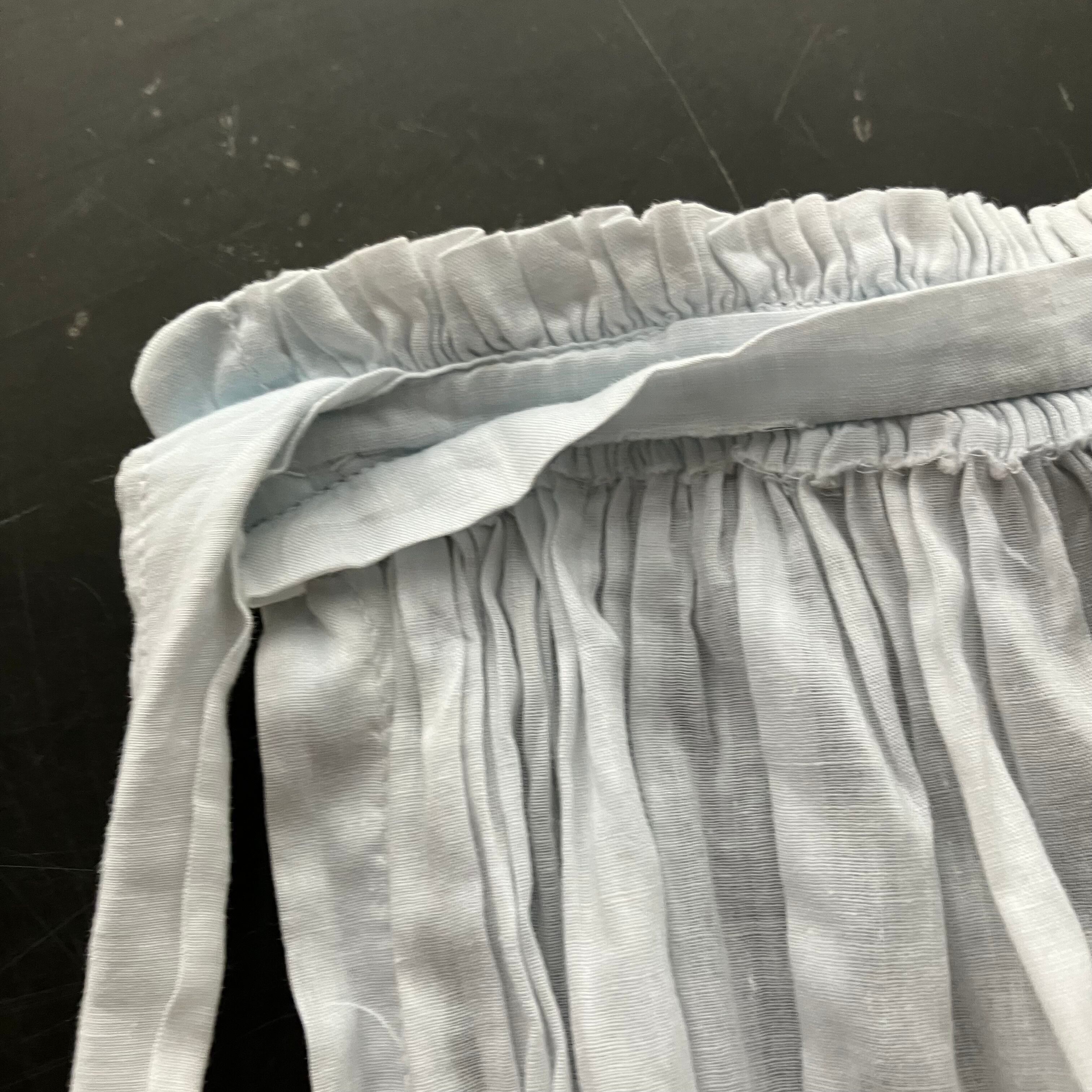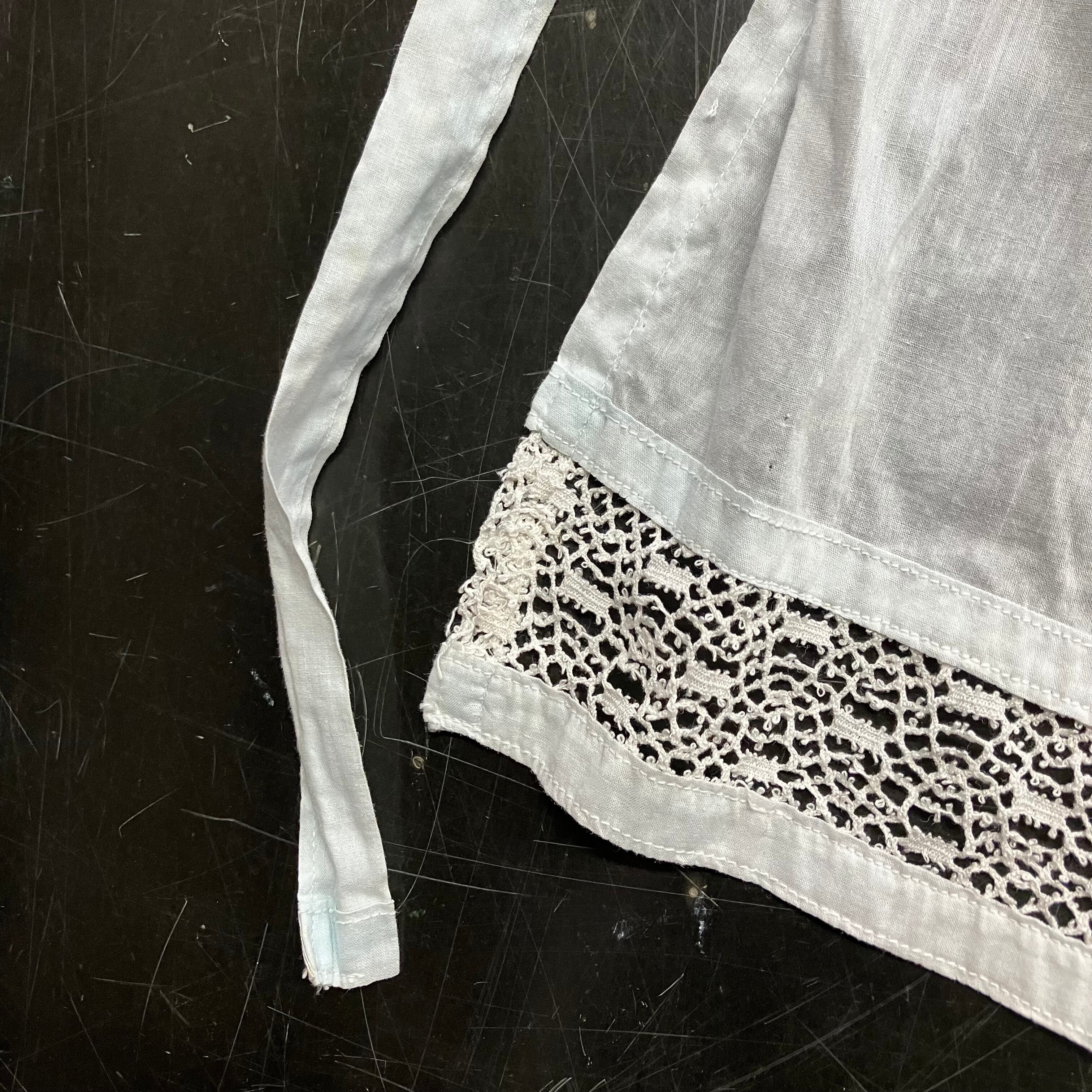 ほんのり水色がかった薄手の生地で作られた、前掛けタイプのエプロンです。