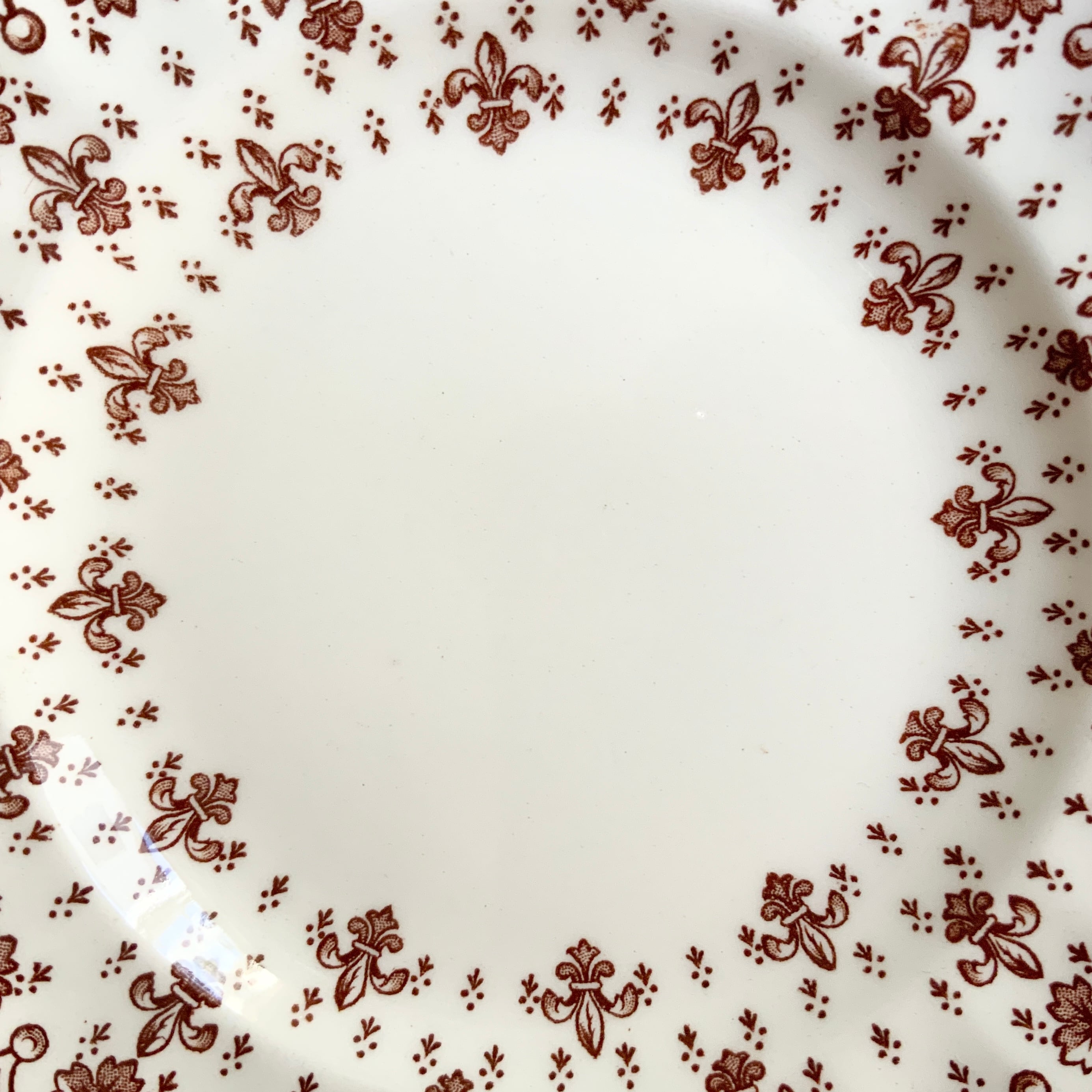 やさしいブラウンで百合やアヤメの紋章、フルールドリスが縁をぐるりと飾っています。その合間にはドットの植物模様が散りばめられ、とても愛らしい雰囲気の一枚です。