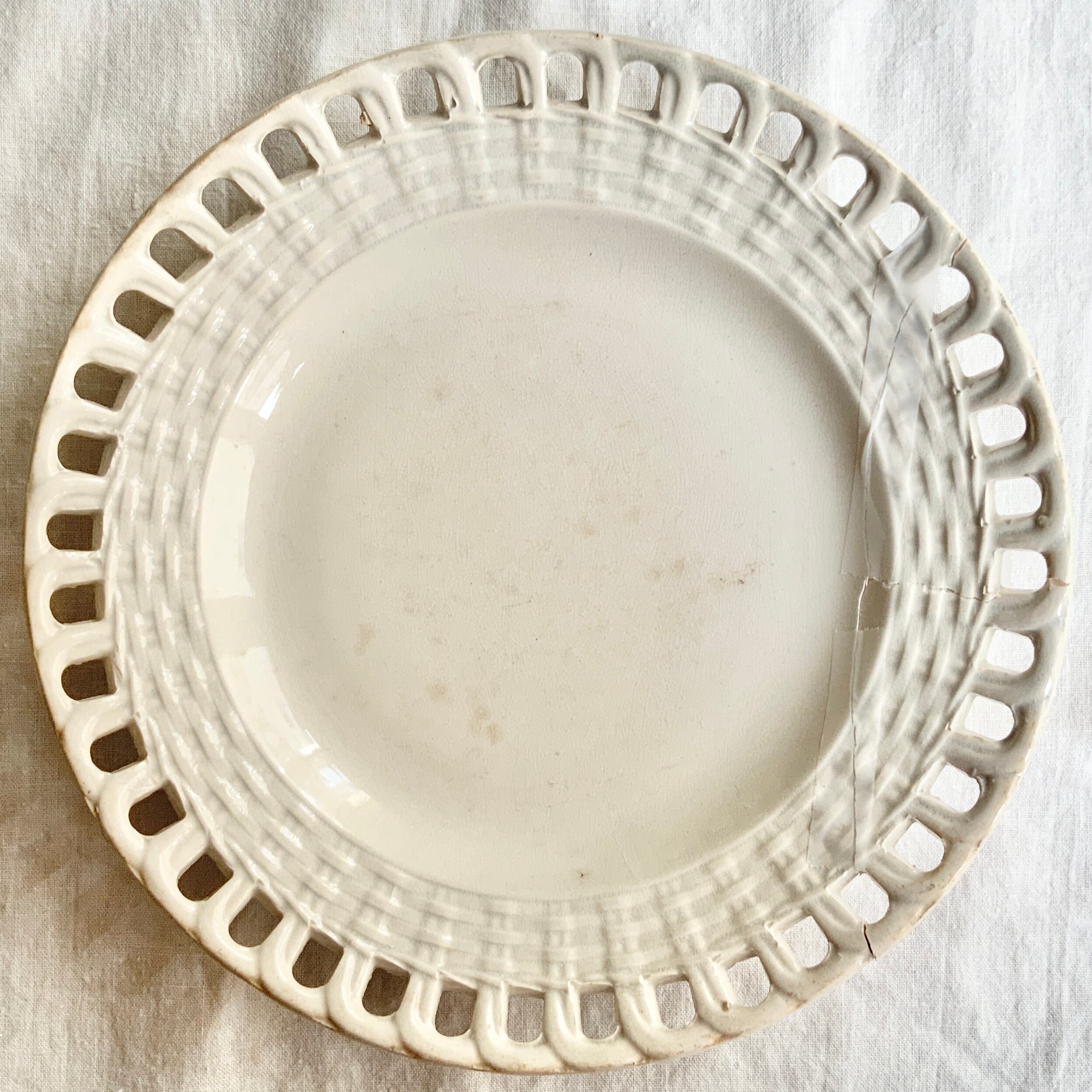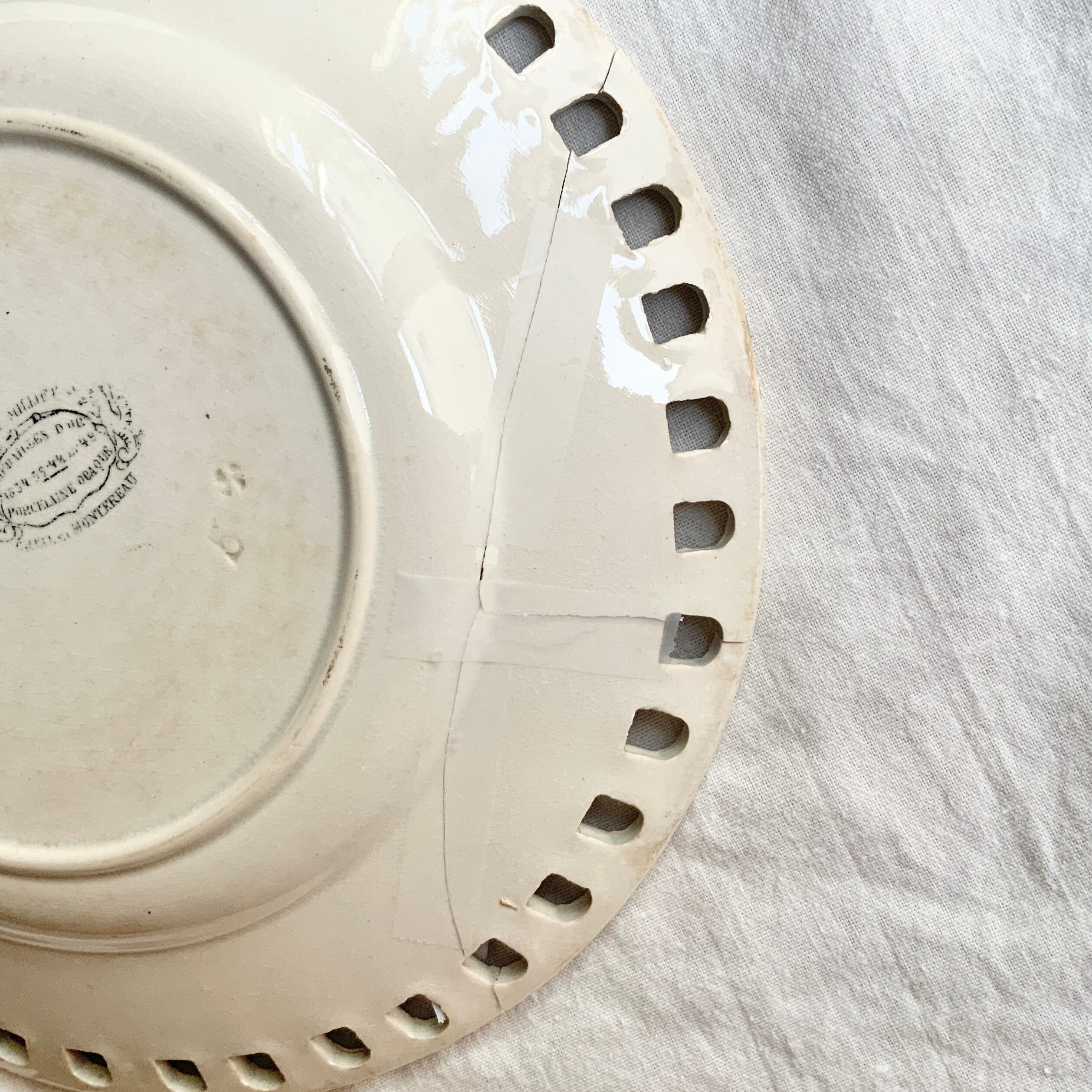 Creil et Montereauらしい白地にパニエの模様と、透かし彫りの装飾が施された美しい一枚ですが、割れてしまっているため金継ぎ用です。