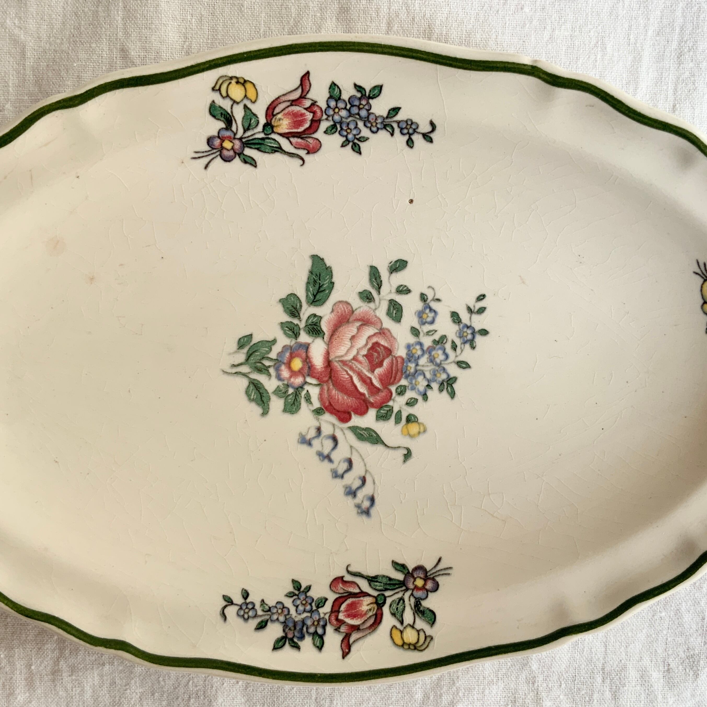あたたかみのある乳白色に美しいバラのブーケや、チューリップなどたくさんの花々が描かれています。縁はグリーンのラインとゆるやかなフラワーリムとロカイユ装飾で飾られています。