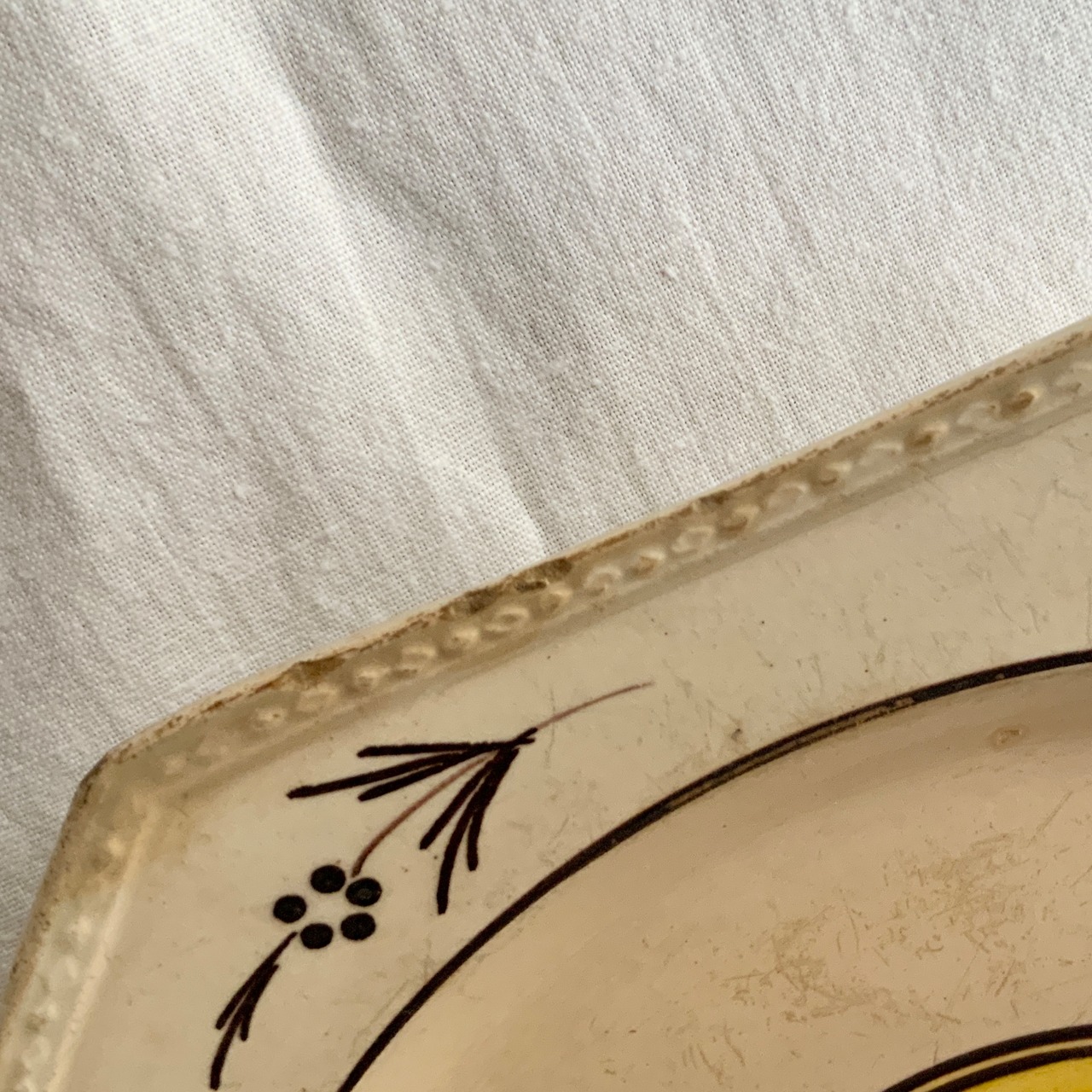 しっとりとした色味に、ブラウンで植物の絵柄が描かれています。中央のイエローとブラウンの配色がとても美しく、縁は小さな菱形で飾られています。