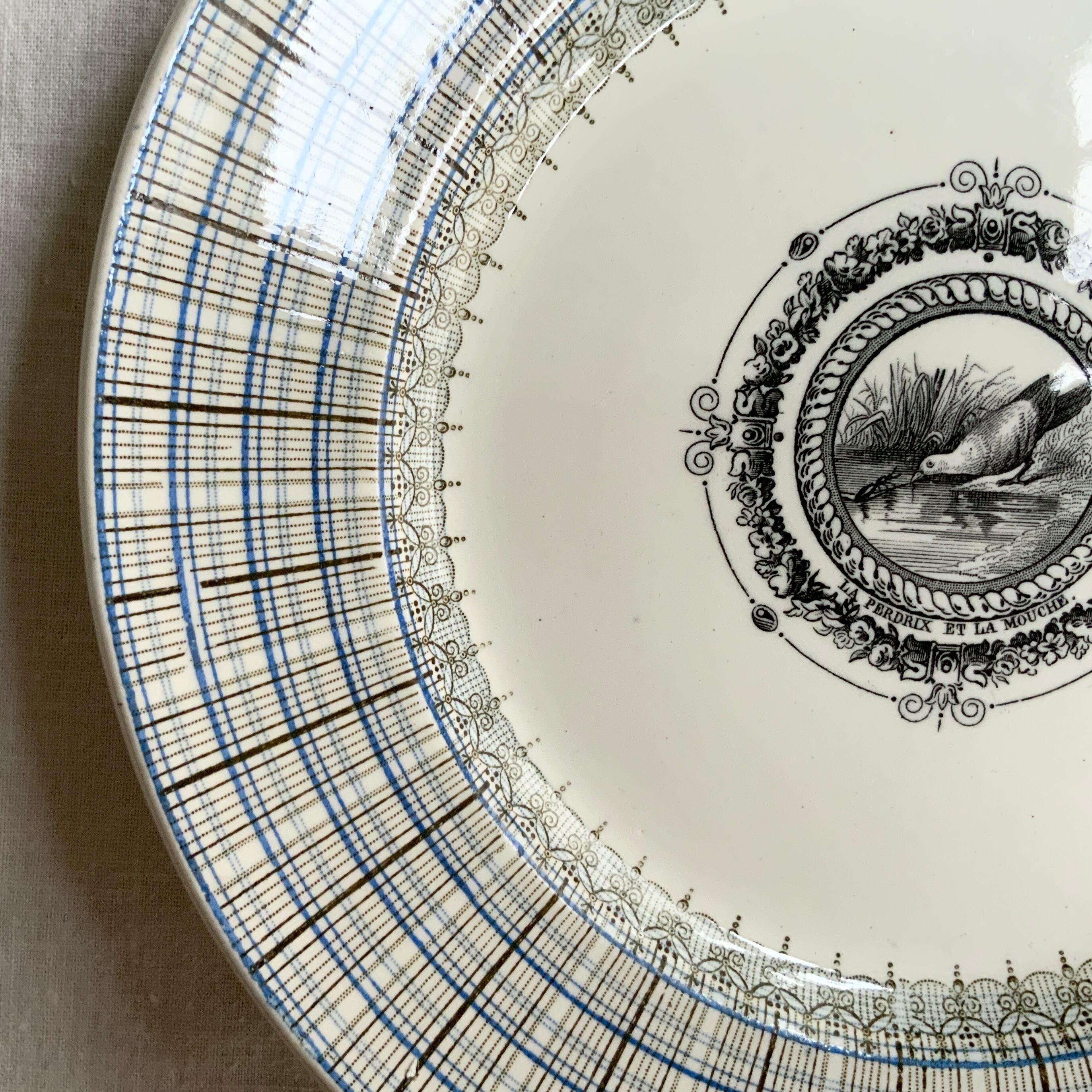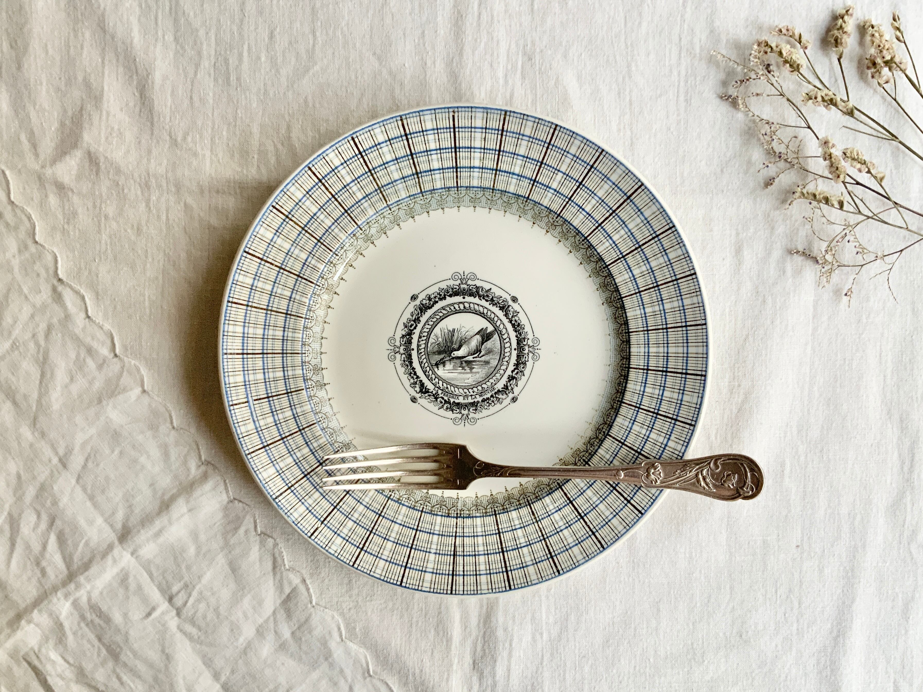 やわらかな白地にブラウンとブルーの可愛いチェック柄がプレートを彩ります。中央には水辺でウズラが虫と挨拶をしているようなグリザイユ。その周りを囲む装飾も美しく、さらにチェック柄の内側にはレースのような愛らしい装飾も施されています。