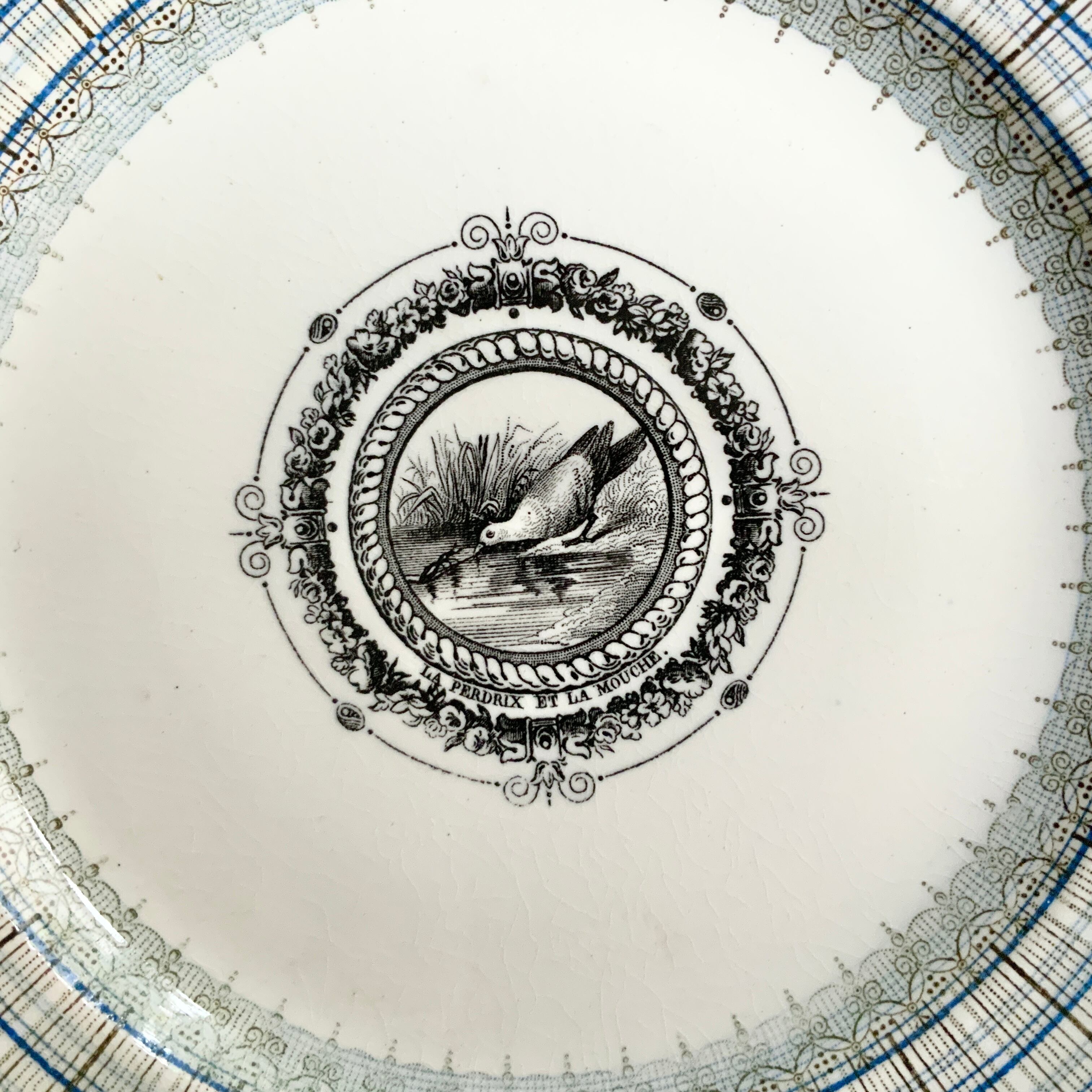 やわらかな白地にブラウンとブルーの可愛いチェック柄がプレートを彩ります。中央には水辺のウズラと虫が挨拶をしているような美しいグリザイユ。その周りを囲む装飾も美しく、さらにチェック柄の内側にはレースのような愛らしい装飾も施されています。