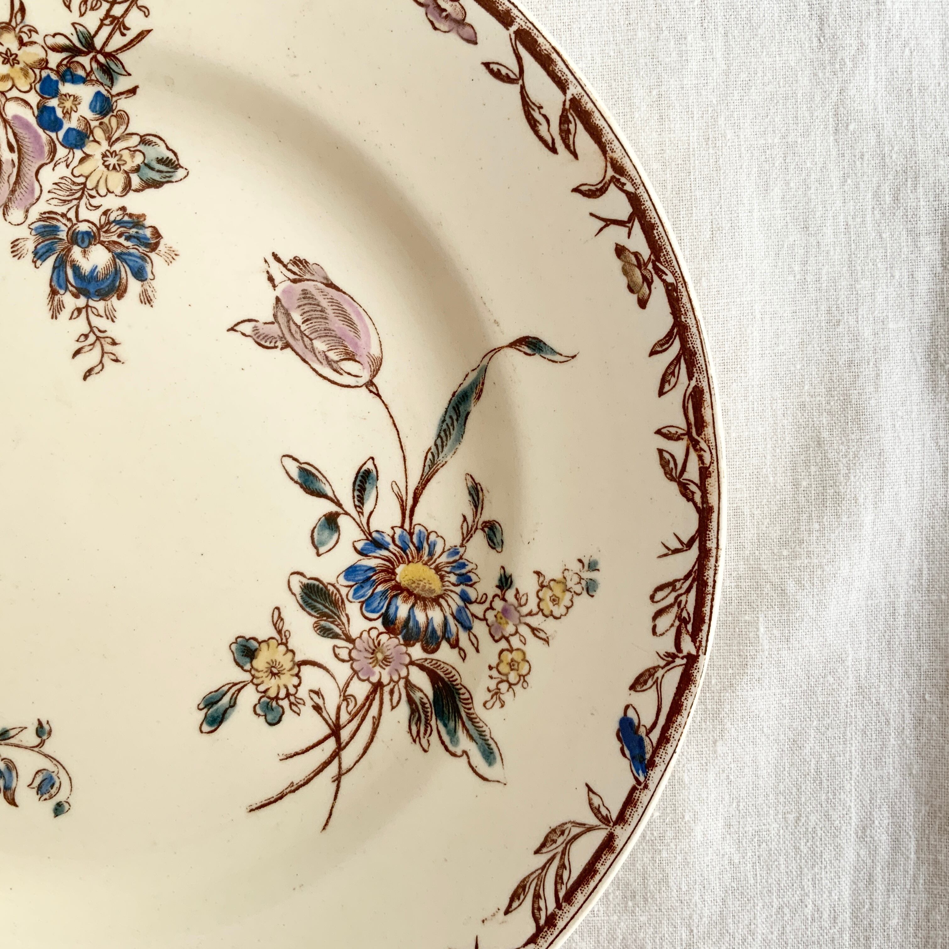 うすい象牙色にブラウンでバラやチューリップ、マムなどの様々な花が描かれ、少しくすんだ美しいカラーで色付けされています。