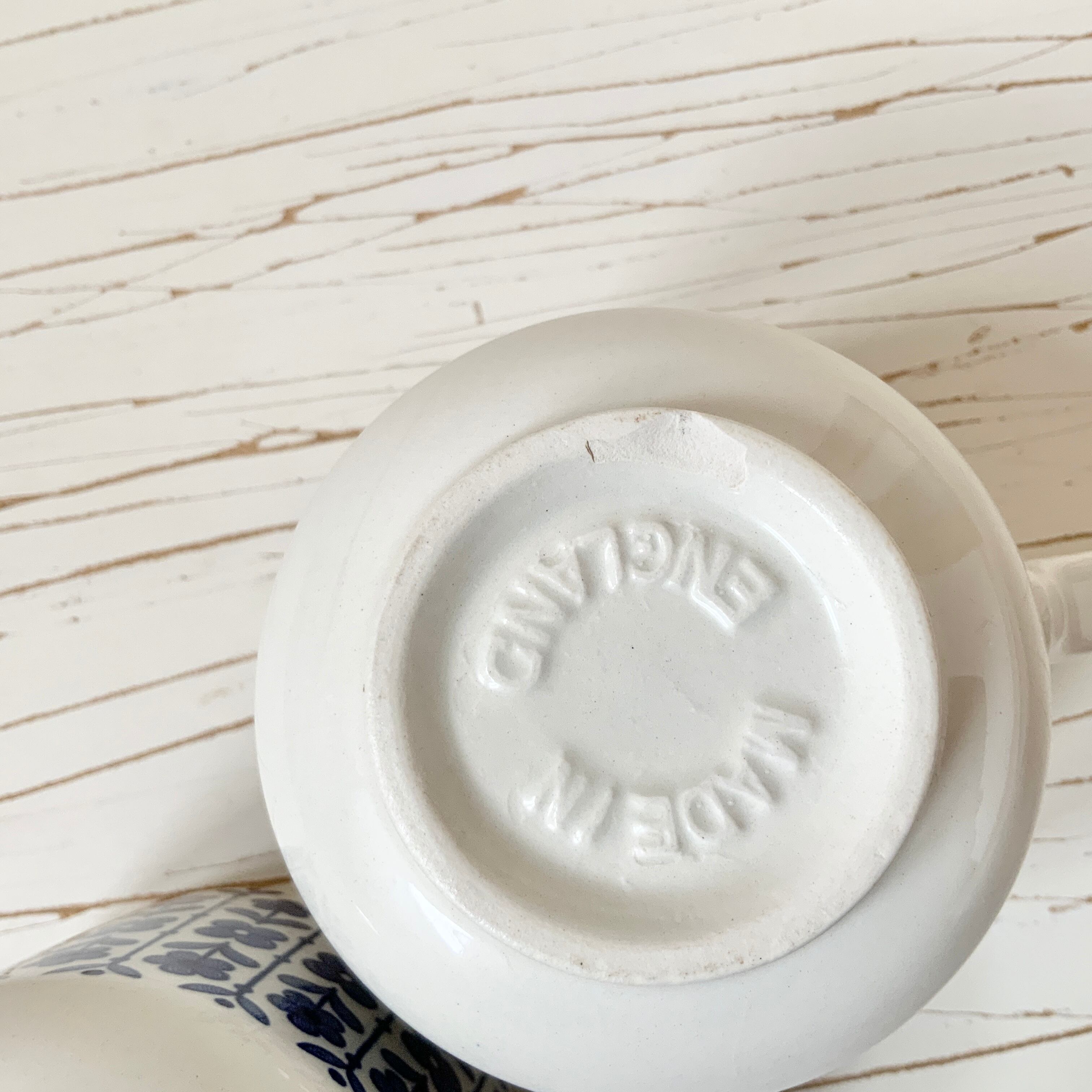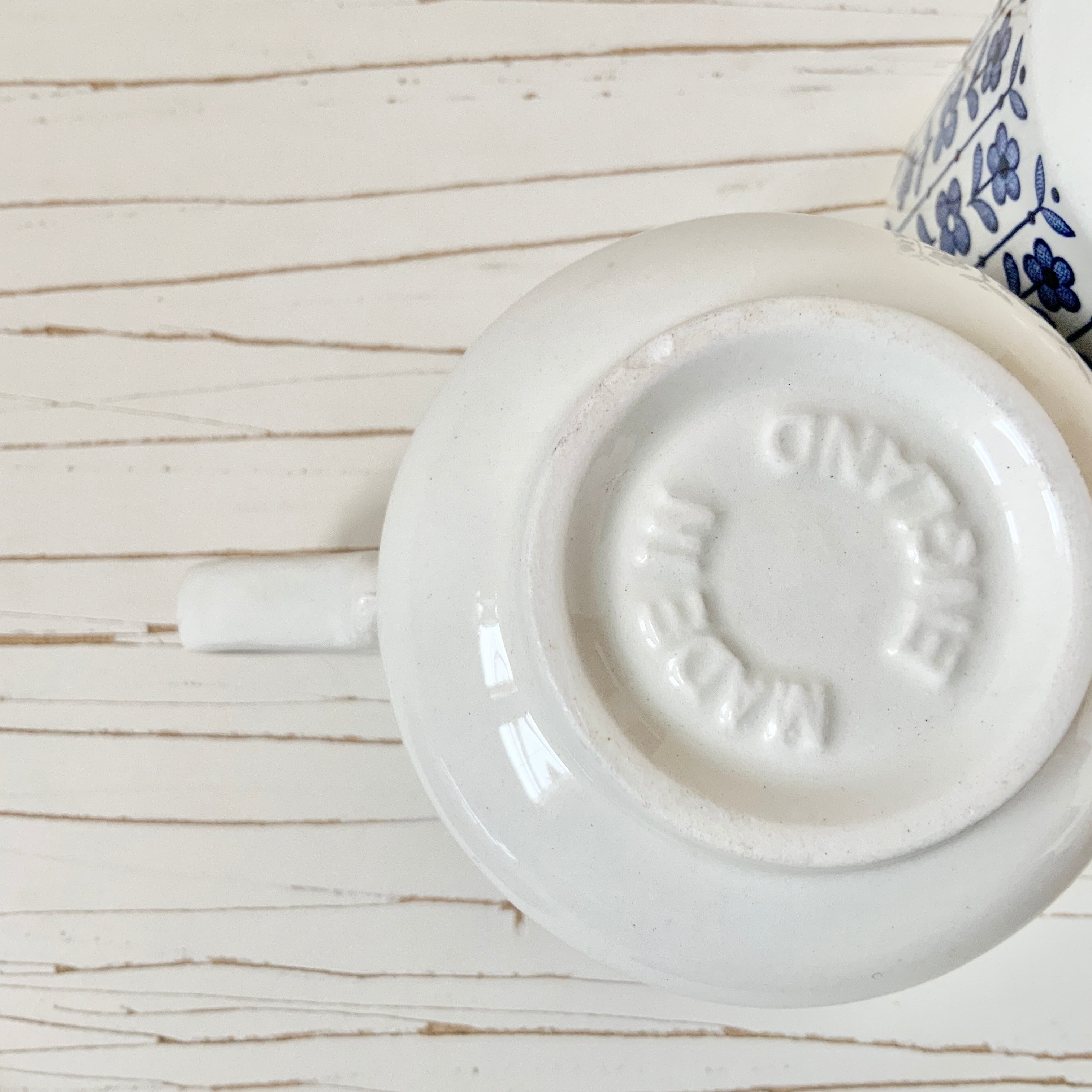ブルーで全体に描かれている小花が愛らしく、ソーサーにはハートモチーフも隠れていて、とても温かみのあるデザインです。