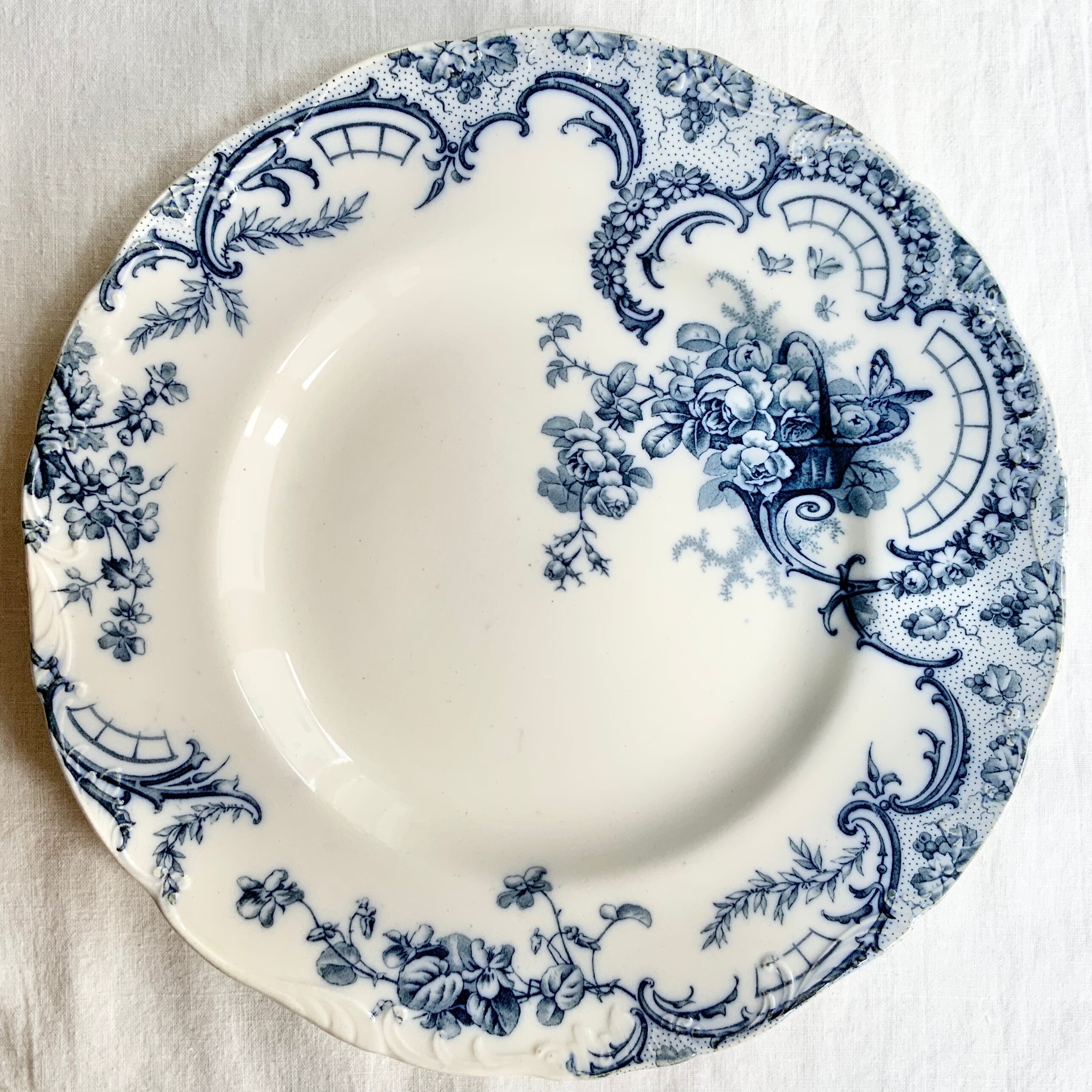 やさしい白地にとても深いブルーで、美しいバラのたくさん入ったパニエが描かれています。その周りにはバラやデイジーのガーランドを纏ったロカイユや、ブドウ、スミレの花など、素晴らしい装飾。背景がドットなのも可愛らしく、縁はロカイユのレリーフで見事に飾られています。