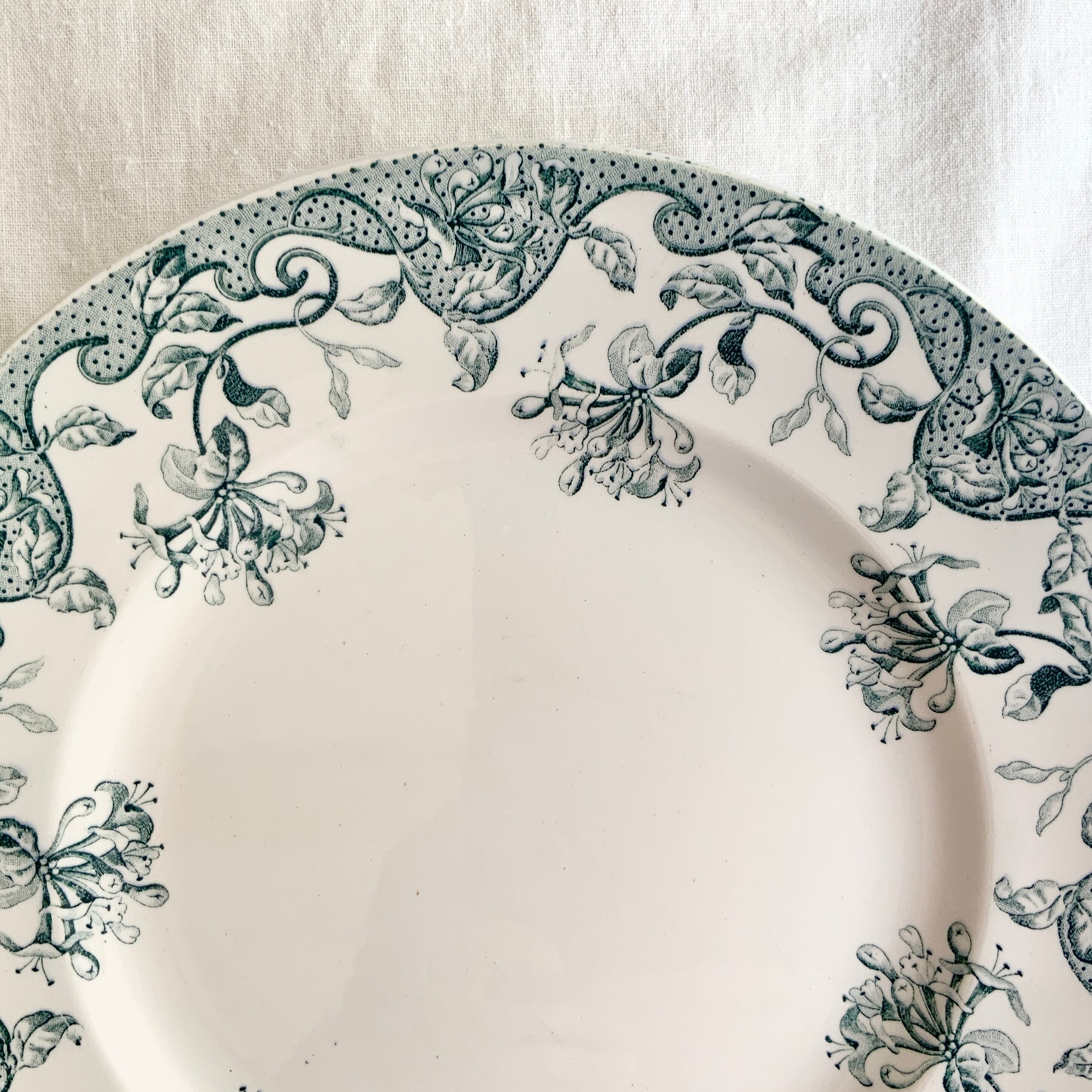 抜けるような白地に、美しいスイカズラの花がたくさん描かれています。蔓のガーランドの背景はドット柄になっていて、愛らしさも感じられる一枚です。