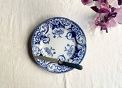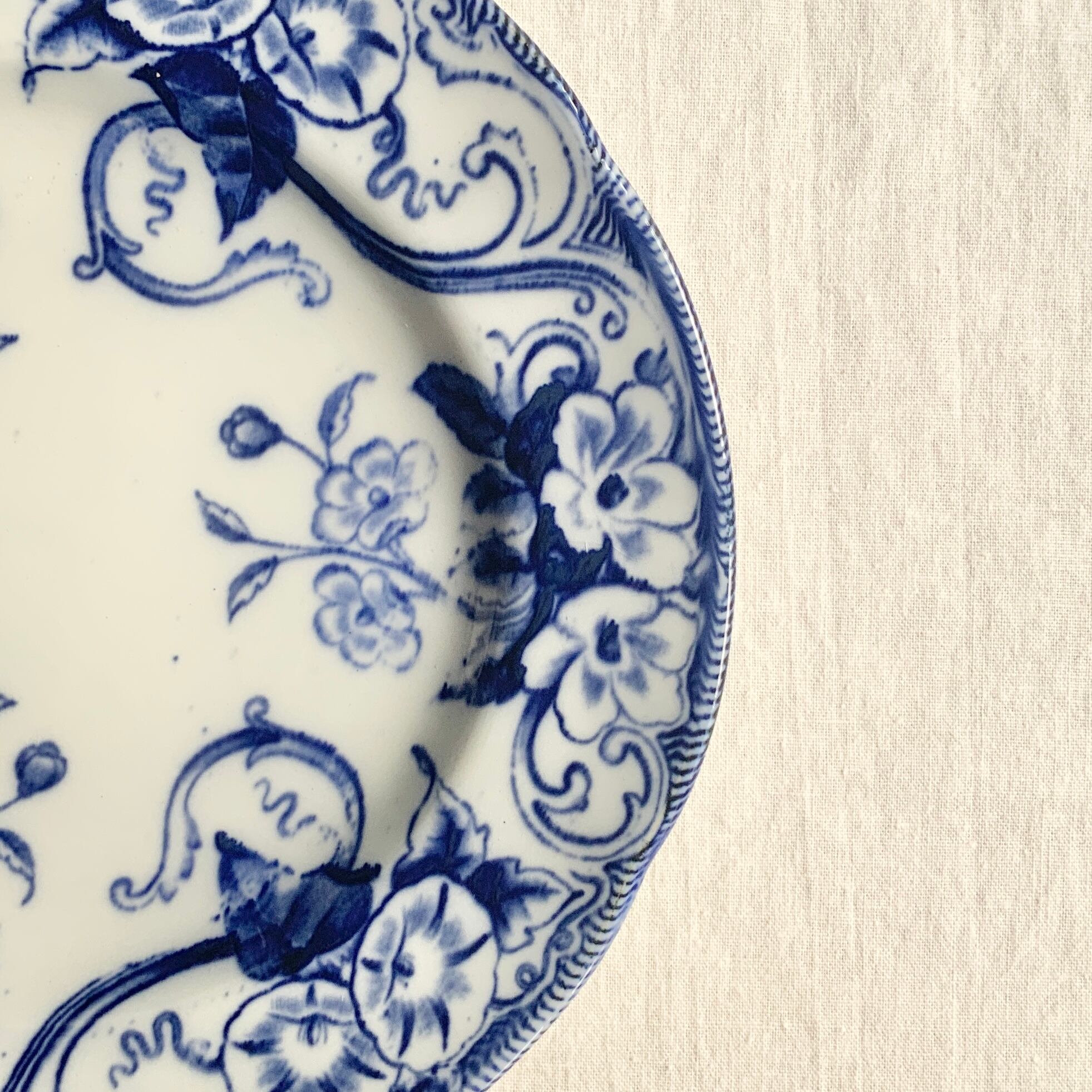 青みがかった透明感のある白地に、深く美しいブルーでアサガオやクチナシの花が描かれています。蔓のロカイユ装飾が美しく、品のある一枚です。
