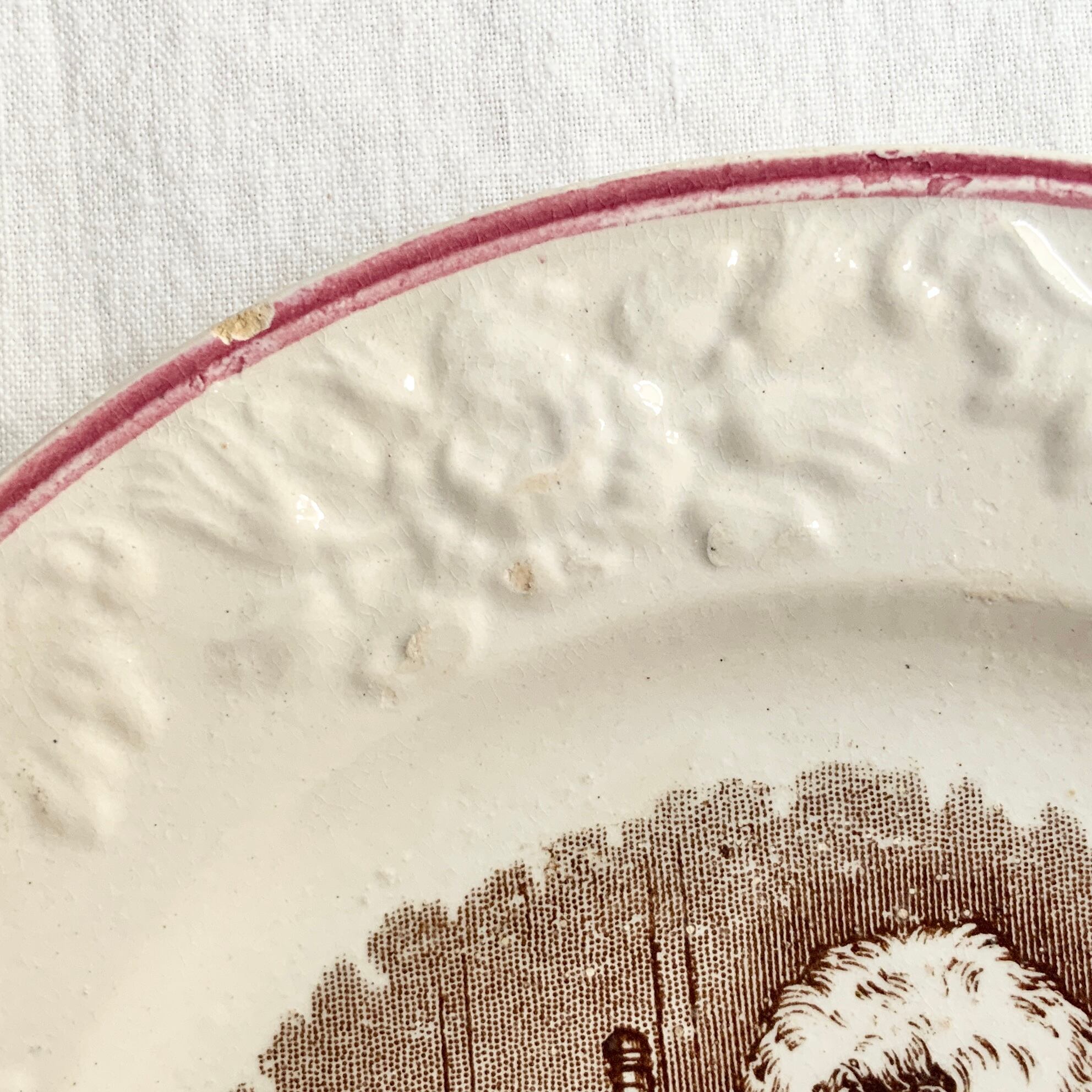 縁はローズレリーフで美しく飾られ、中央にはブラウンでたくさんのわんこが描かれています。