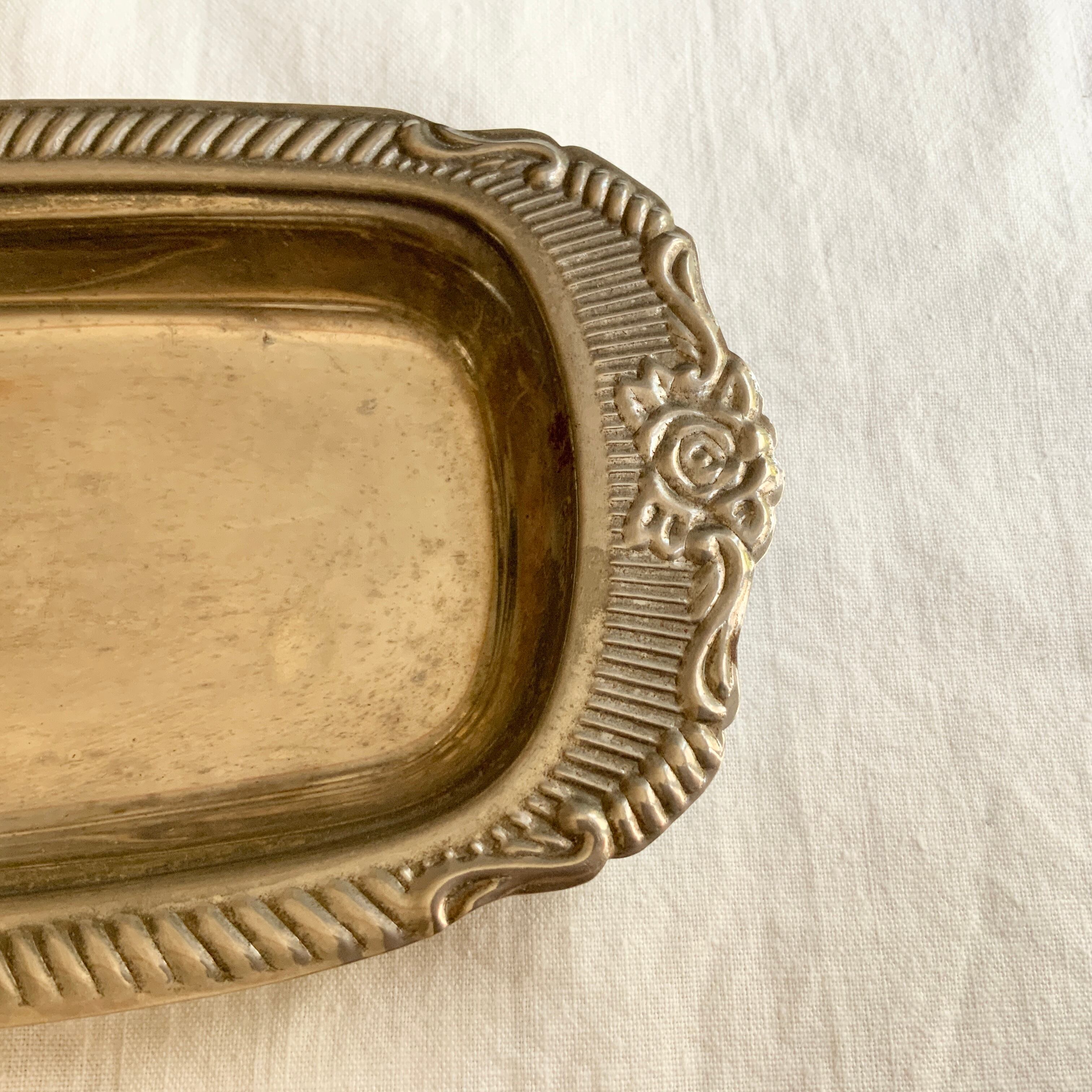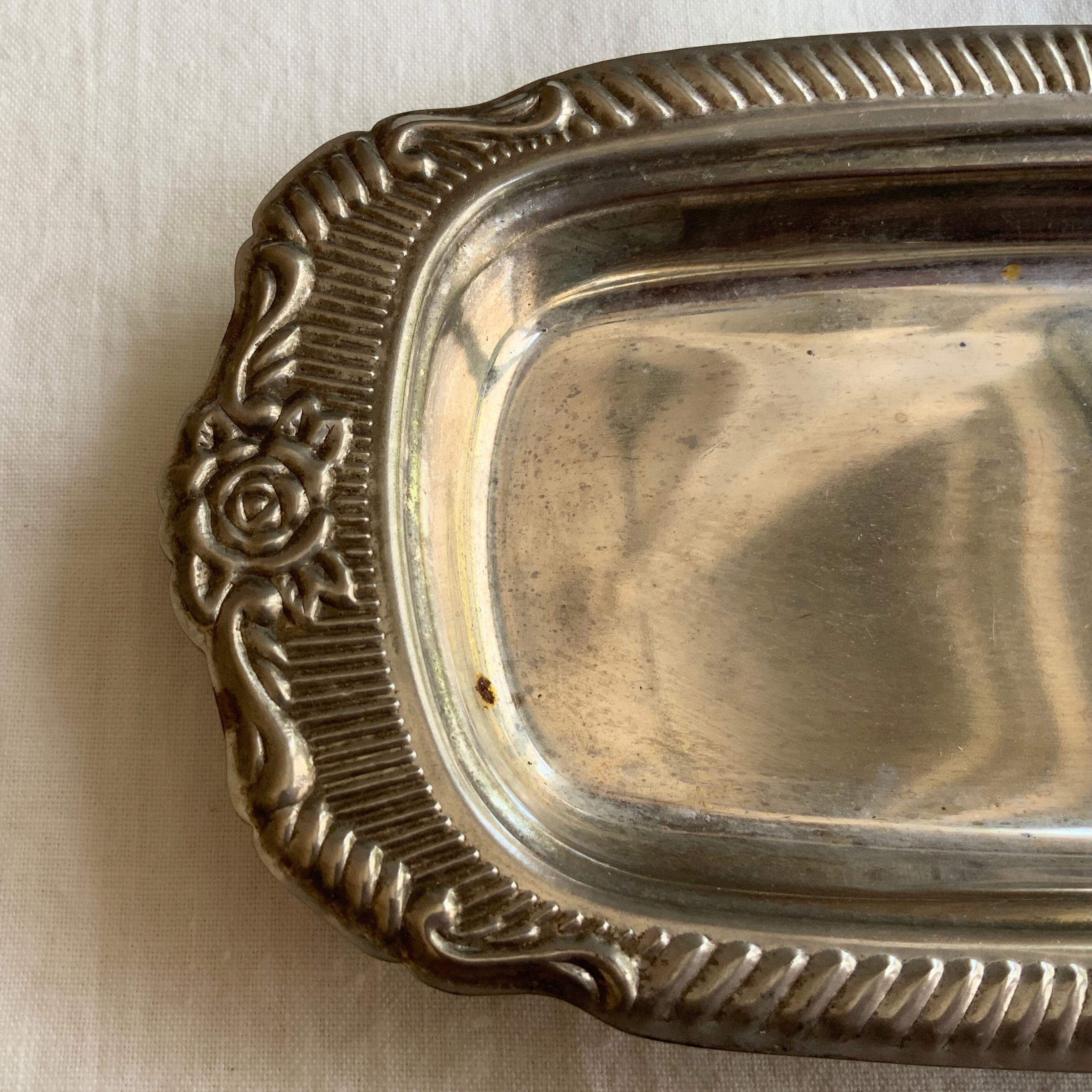 縁のバラやロカイユの装飾が美しく、ステンレスながら経年によりシルバーのような風合いのある一枚です。