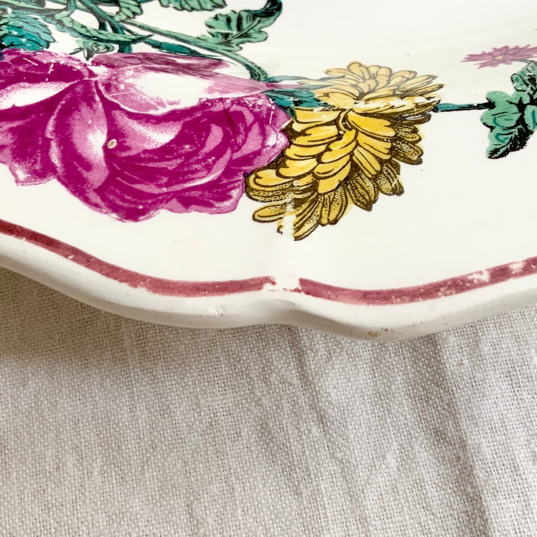 やわらかな地色に、バラやマム、スイセンやポピーなど、たくさんの野花がプレート全体に美しく描かれています。