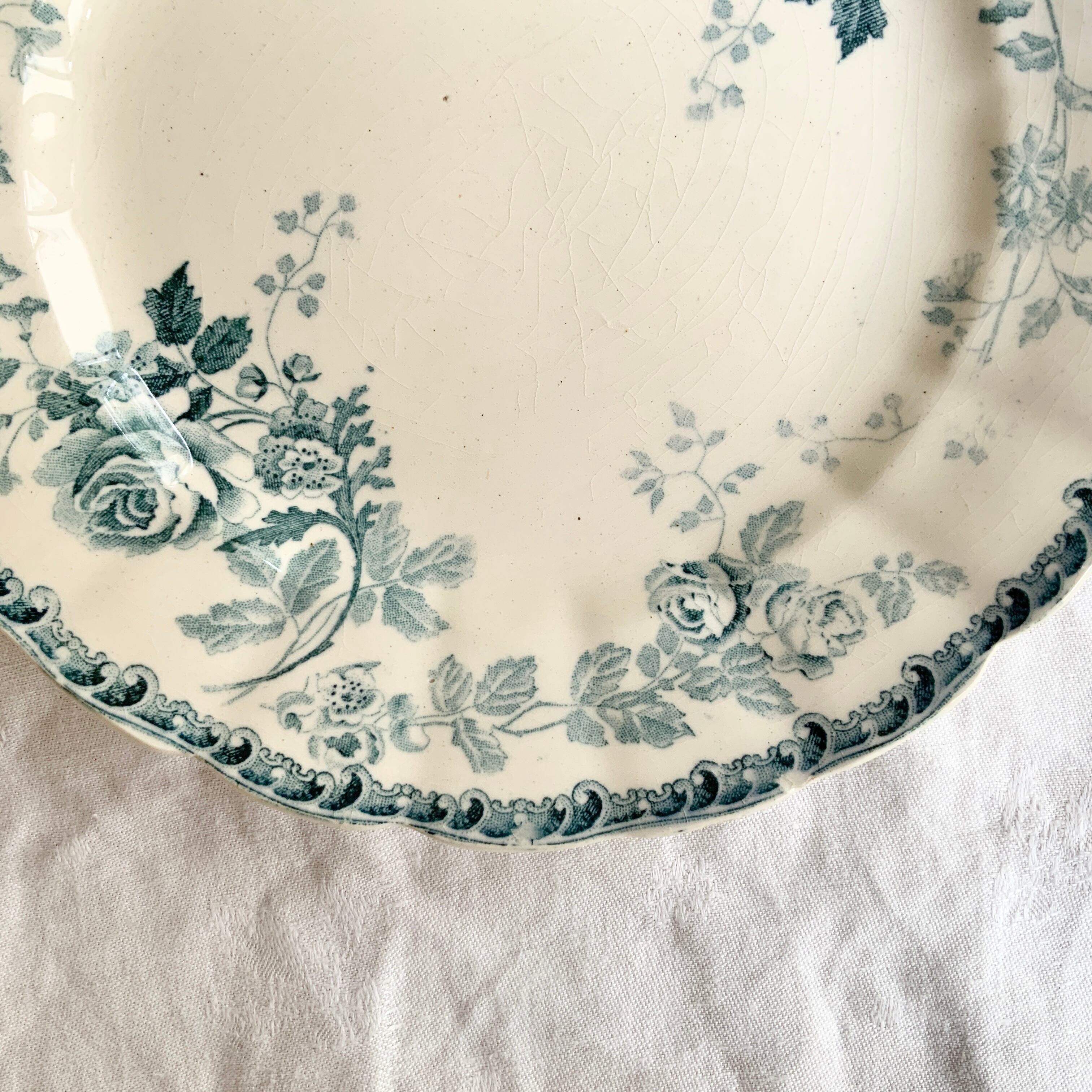 やわらかな地色に透明感のあるブルーがかったグリーンで、美しいバラが描かれています。その周りには可愛らしいマーガレットが淡い色合いで添えられています。