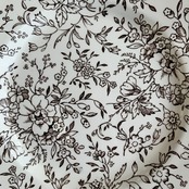 やわらかな白地に、落ち着いたブラウンで小さなバラの花が全体に散りばめられています。所々にころんとした小花やまん丸の実が、とても愛らしく描かれています。