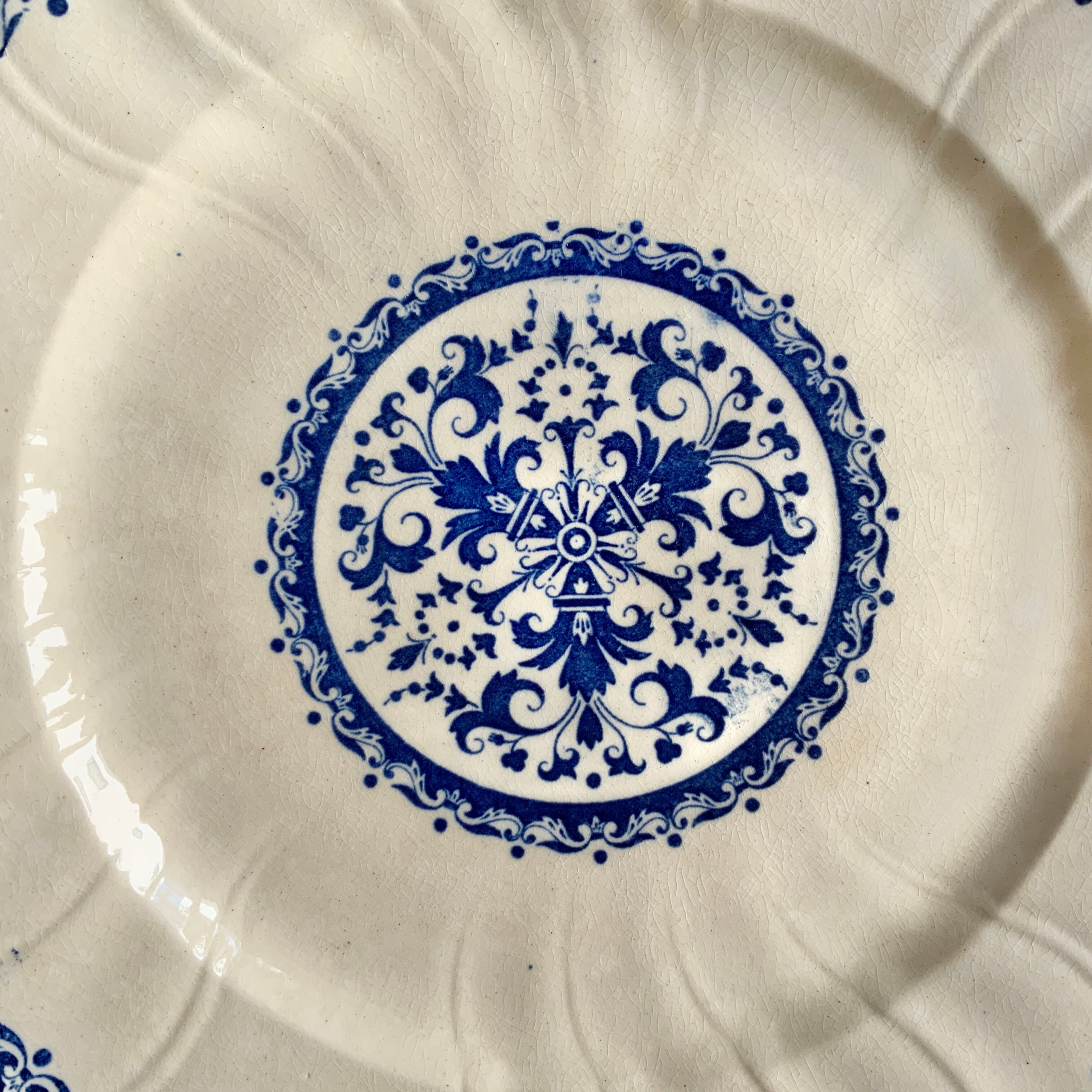 美しい象牙色に、深みのあるブルーで美しいロカイユ装飾の模様が描かれています。