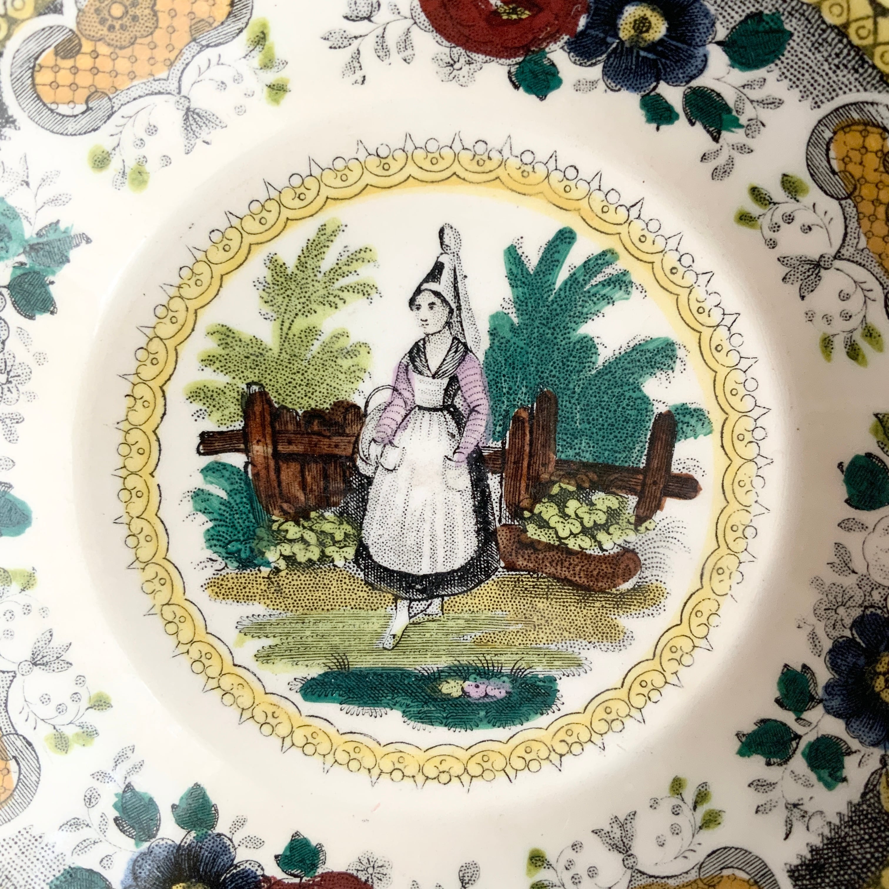 縁には様々な色合いのバラとロカイユが描かれた、美しくも愛らしい一枚です。