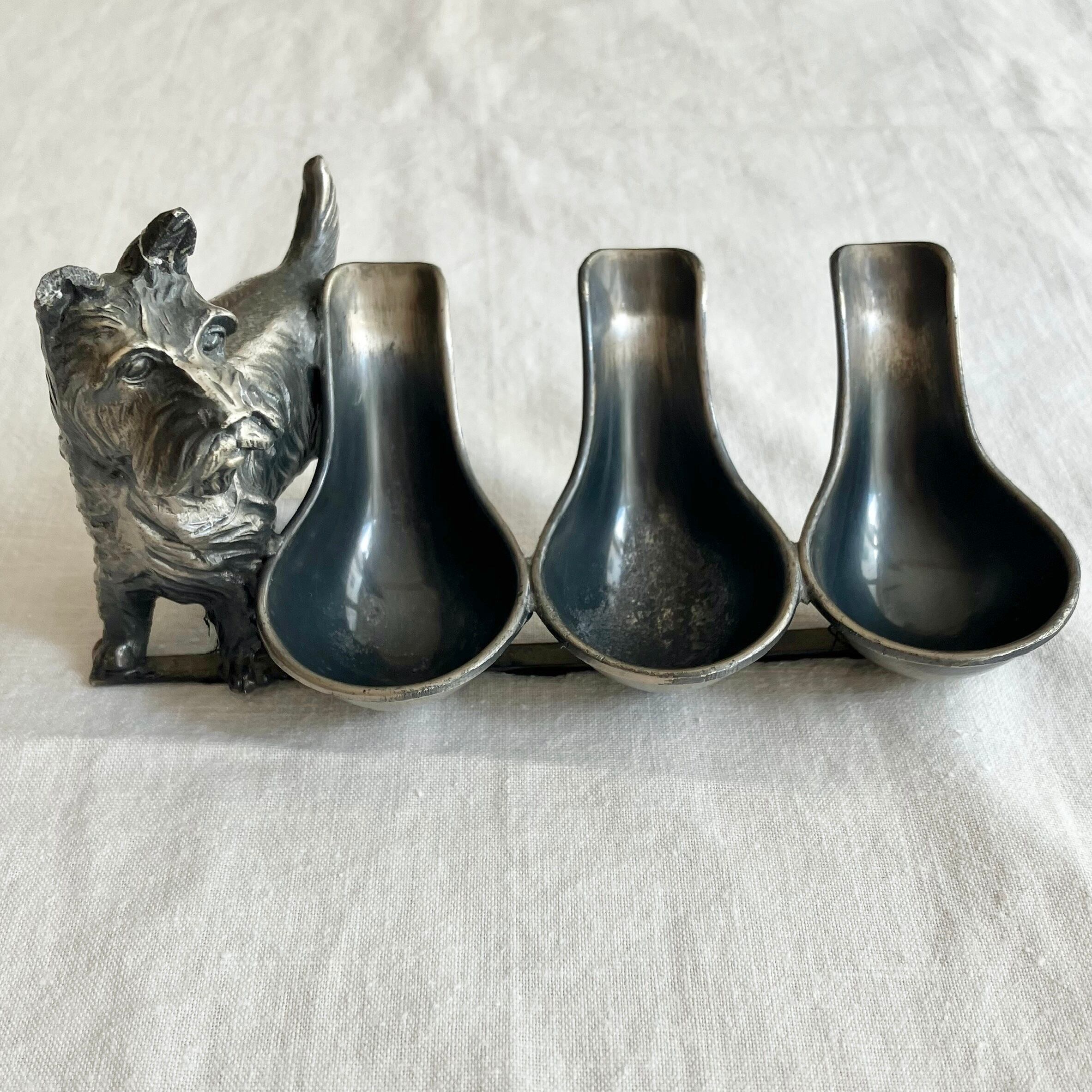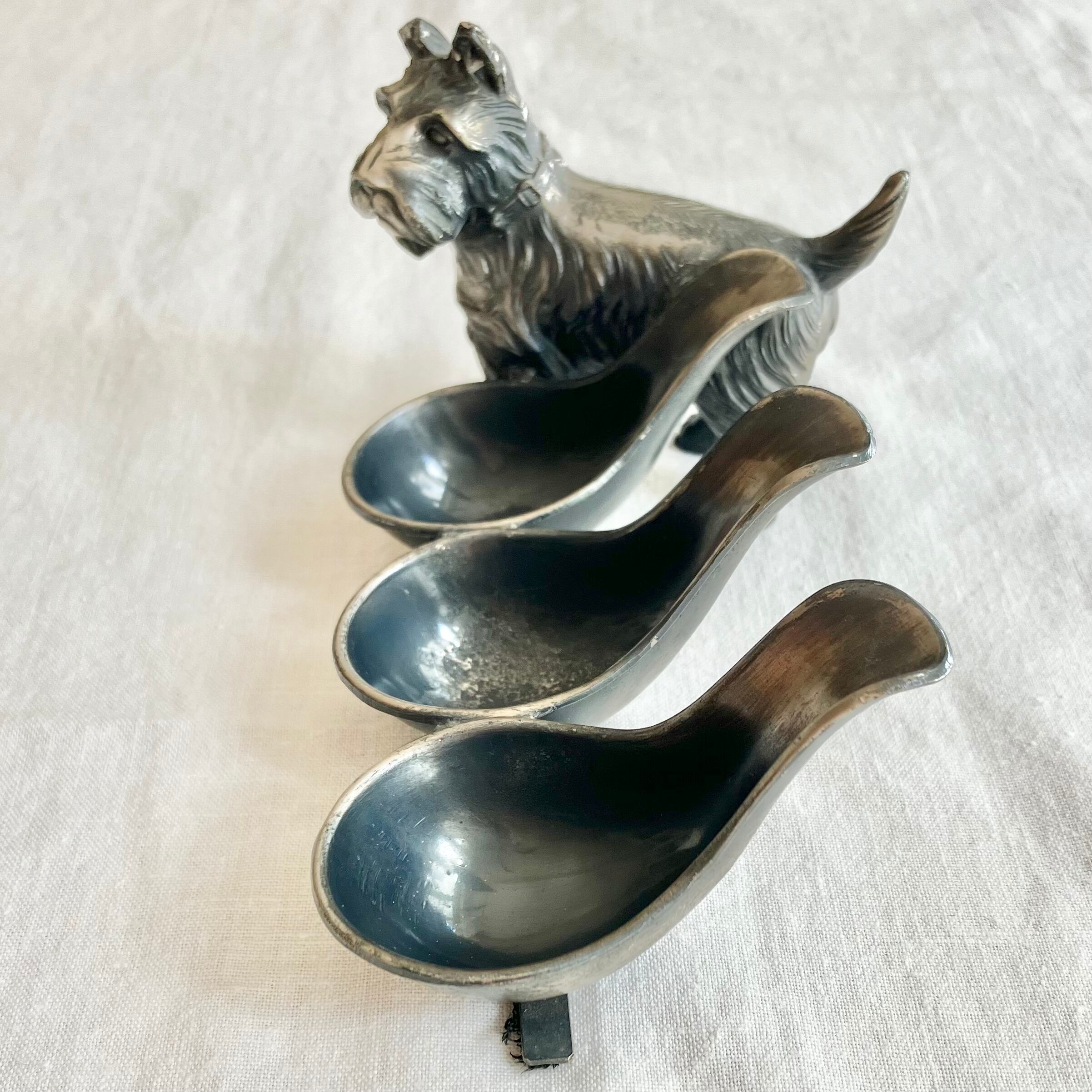 可愛らしいテリア犬モチーフの置物と、三つのスプーンのかたちの小さな器がひとつになっています。