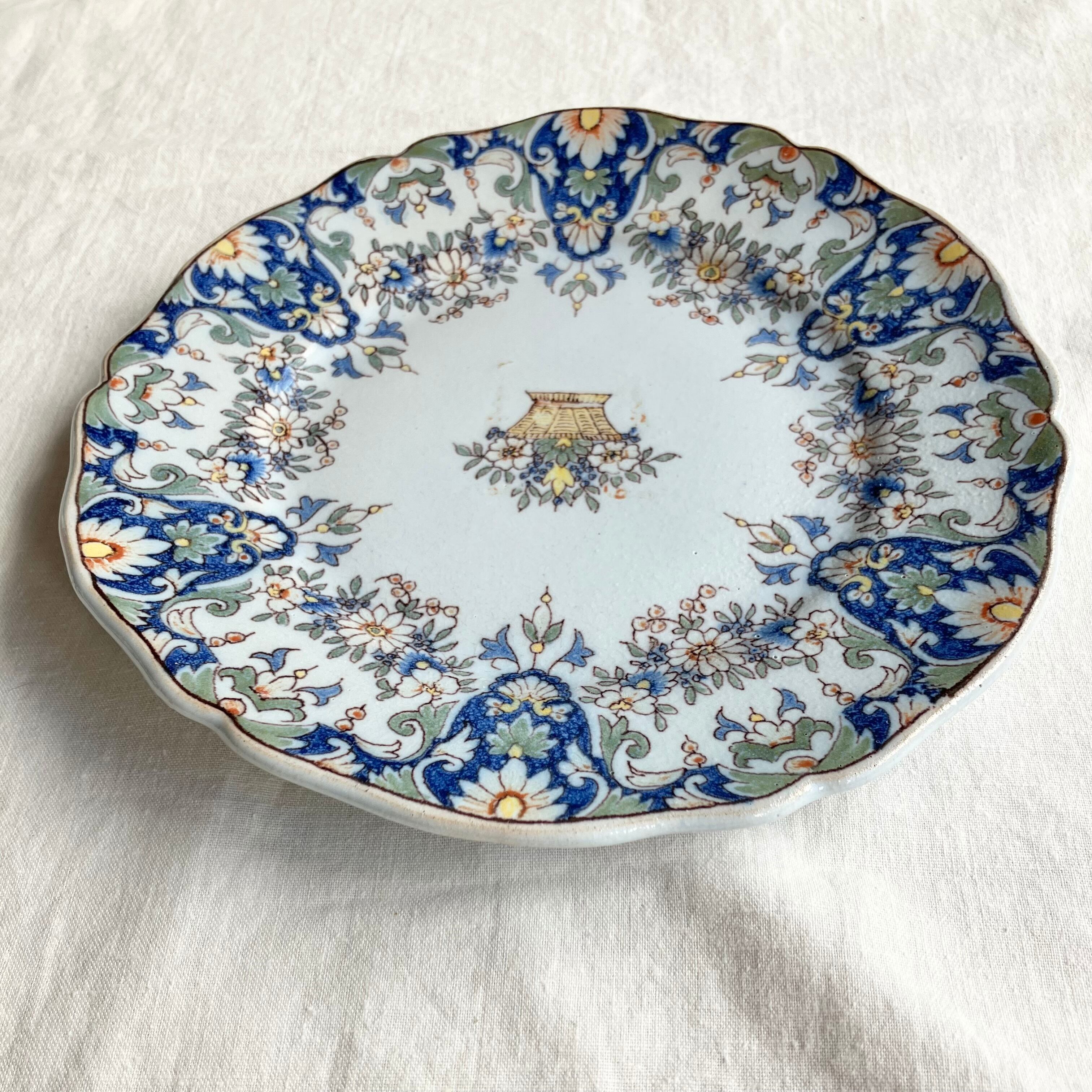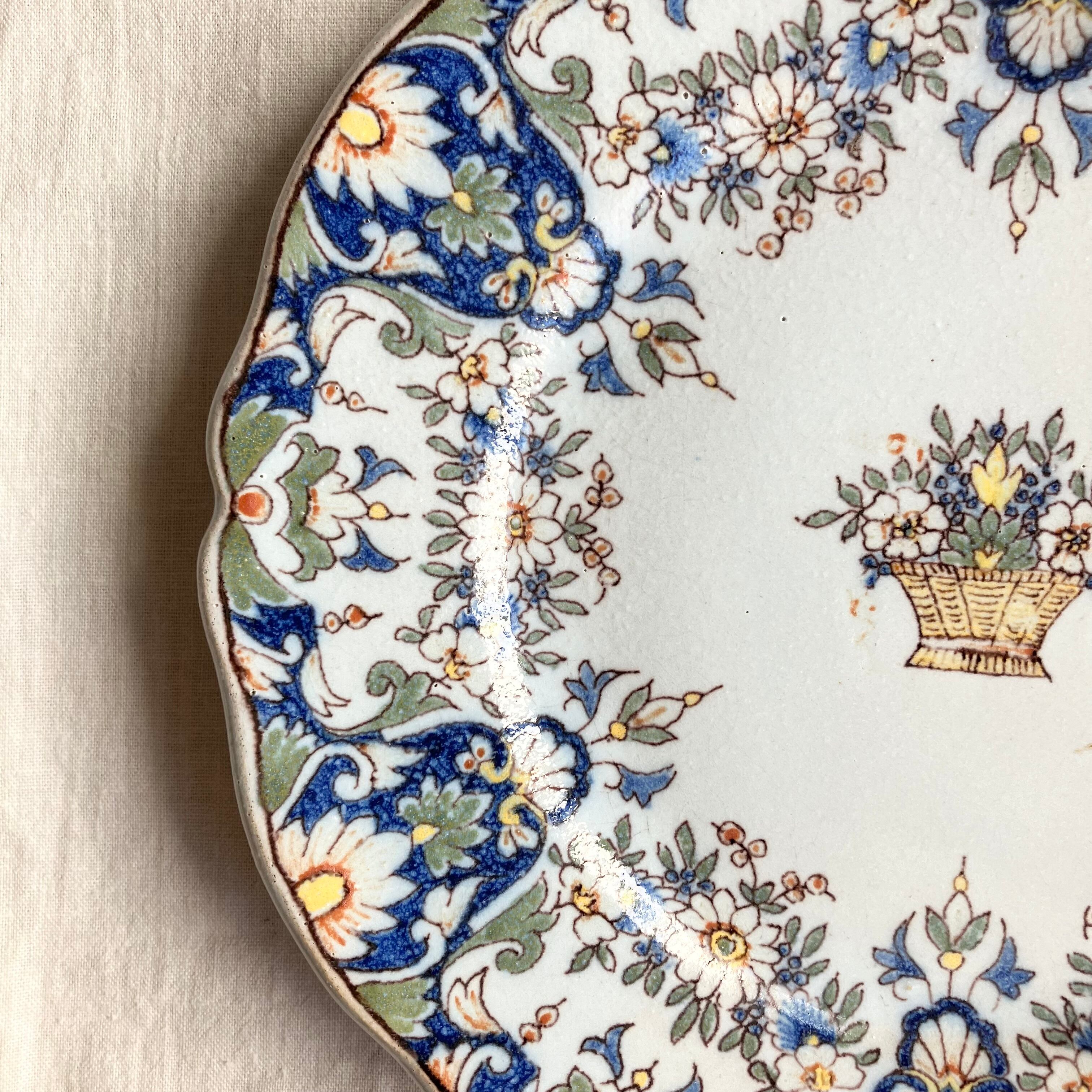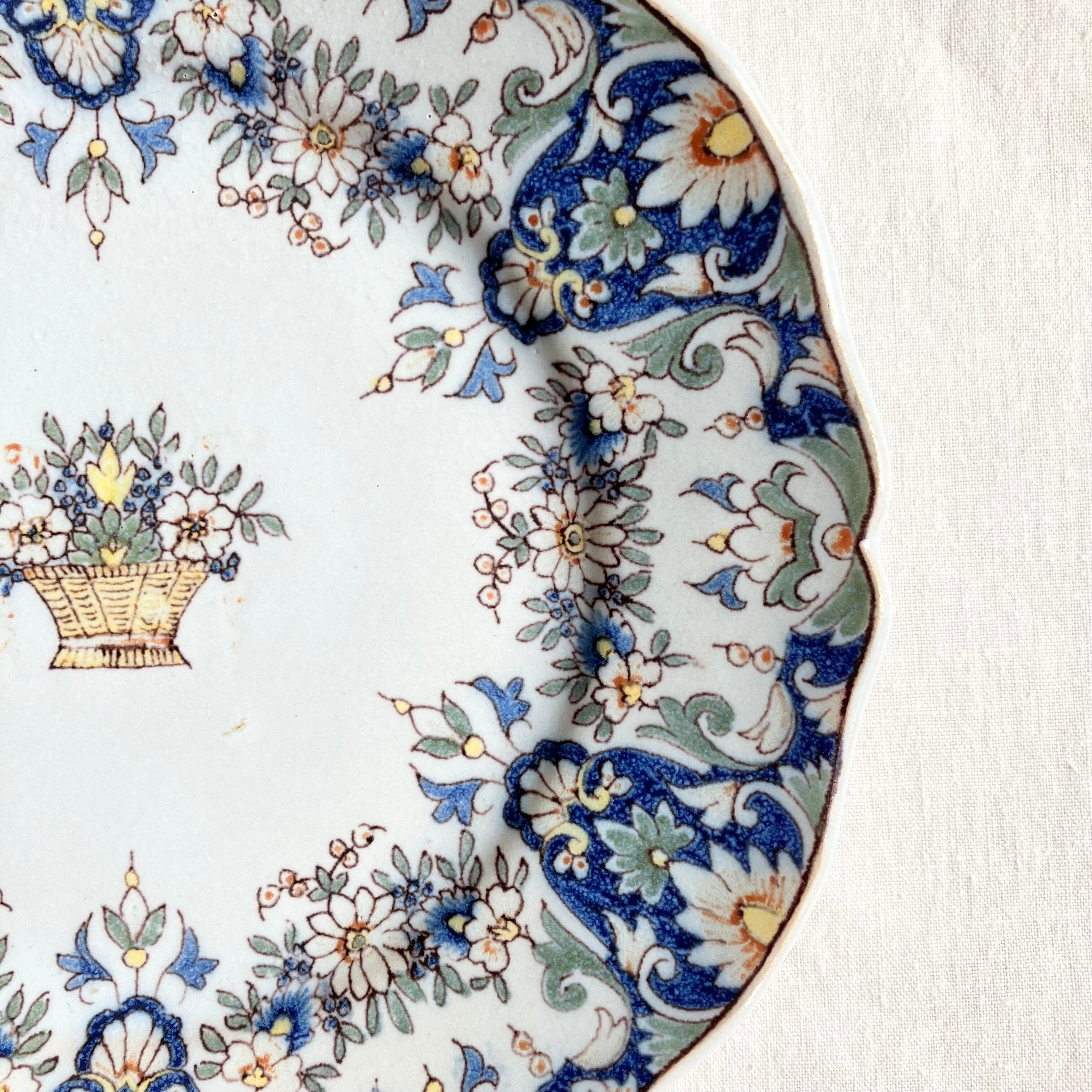 Rouenらしい多彩な色味で、花やロカイユ装飾が描かれています。中央には白い花が飾られたパニエが描かれ、とても華やかな一枚です。