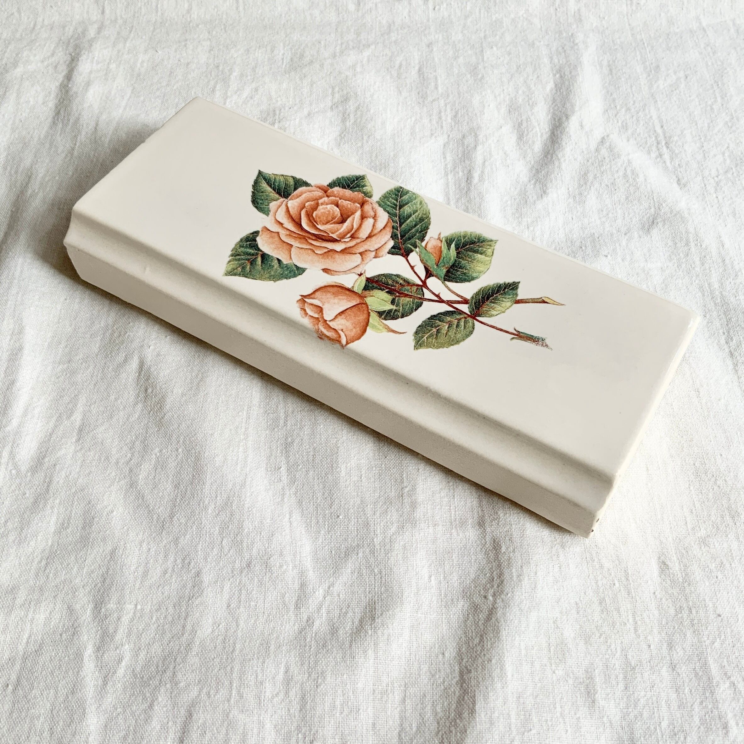 やわらかな地色に、オレンジがかったピンク色のバラが美しく描かれていいます。穴があるので、壁に掛けられます。