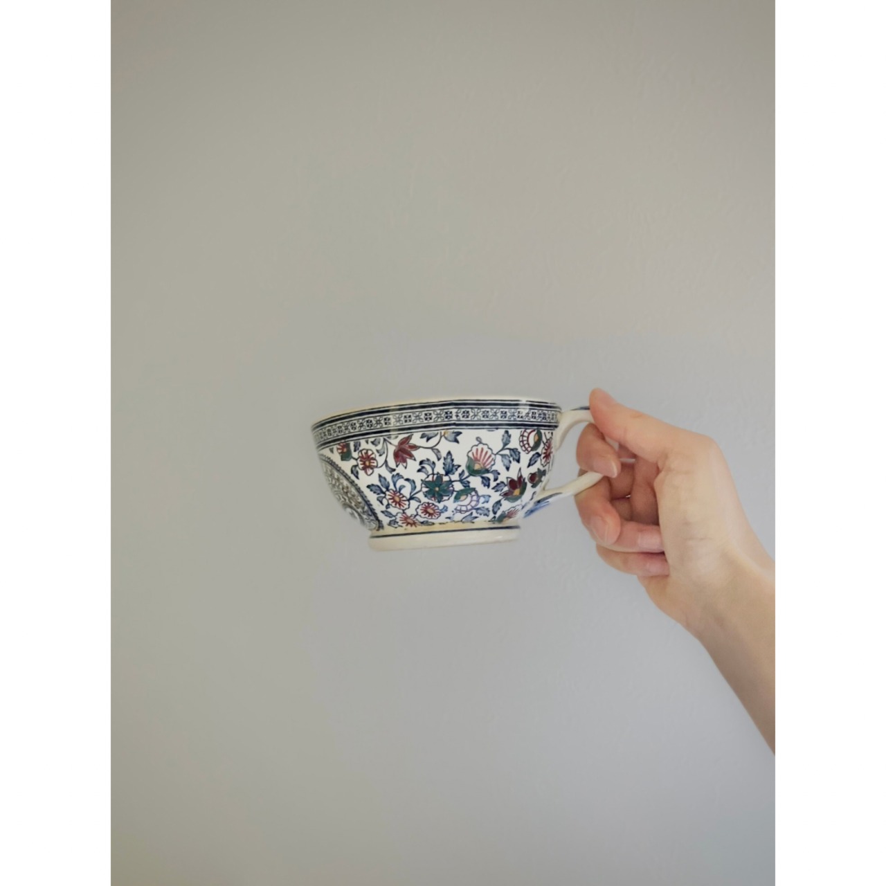 やわらかい地色深みのあるブルーで、大変美しいペイズリーの総柄がカップ全体に描かれています。