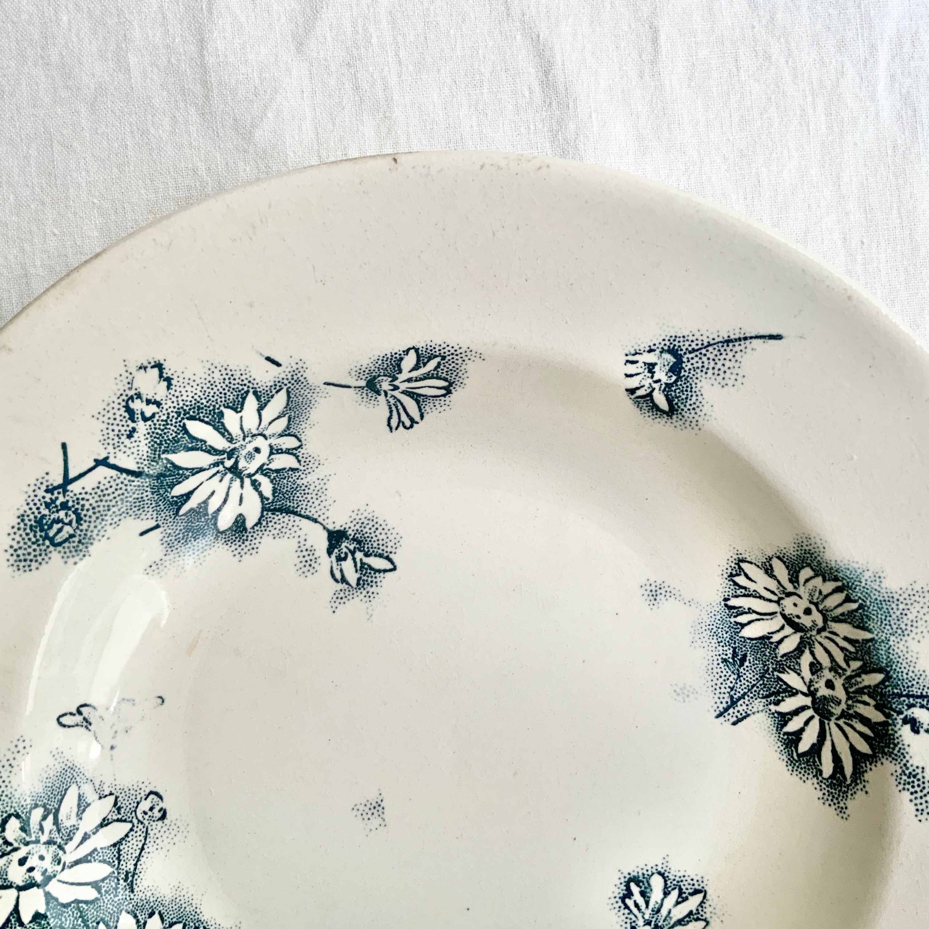 やわらかい白地にくすんだ感じのブルーで、たくさんのマーガレットがプレート全面に散りばめられています。