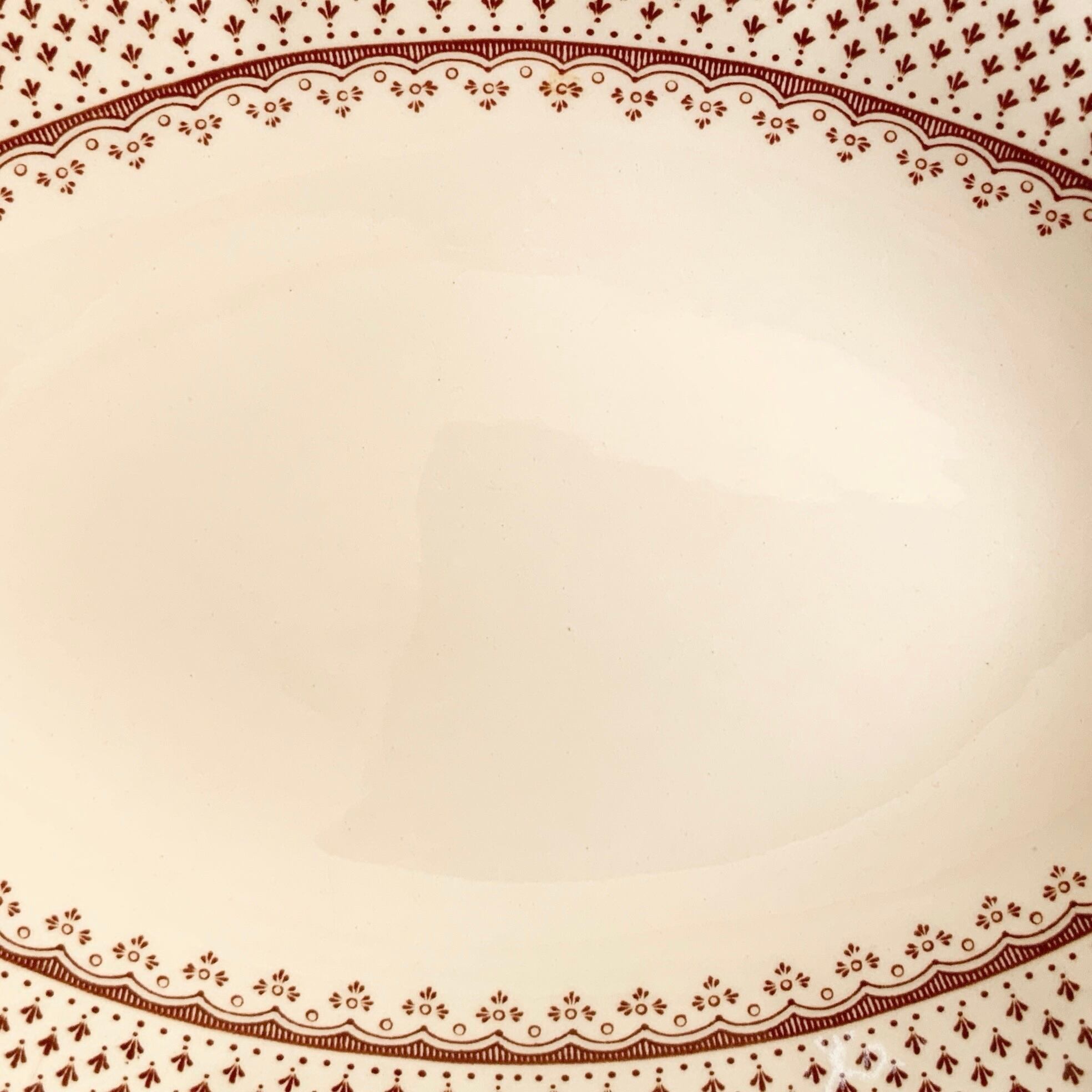 やわらかい地色に、暖かみのあるブラウンで小さなフルールドリス模様がドットのように散りばめられています。内側にはレースのような愛らしい装飾が描かれ、とても可愛い一枚です。