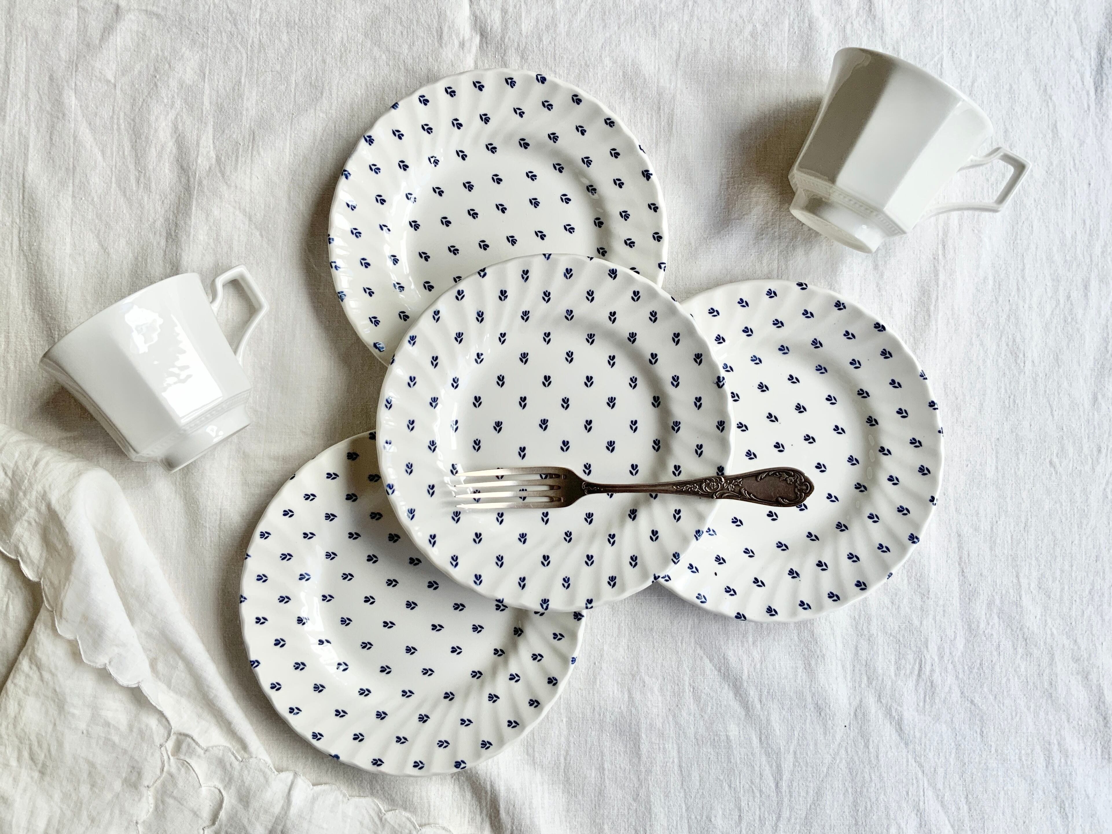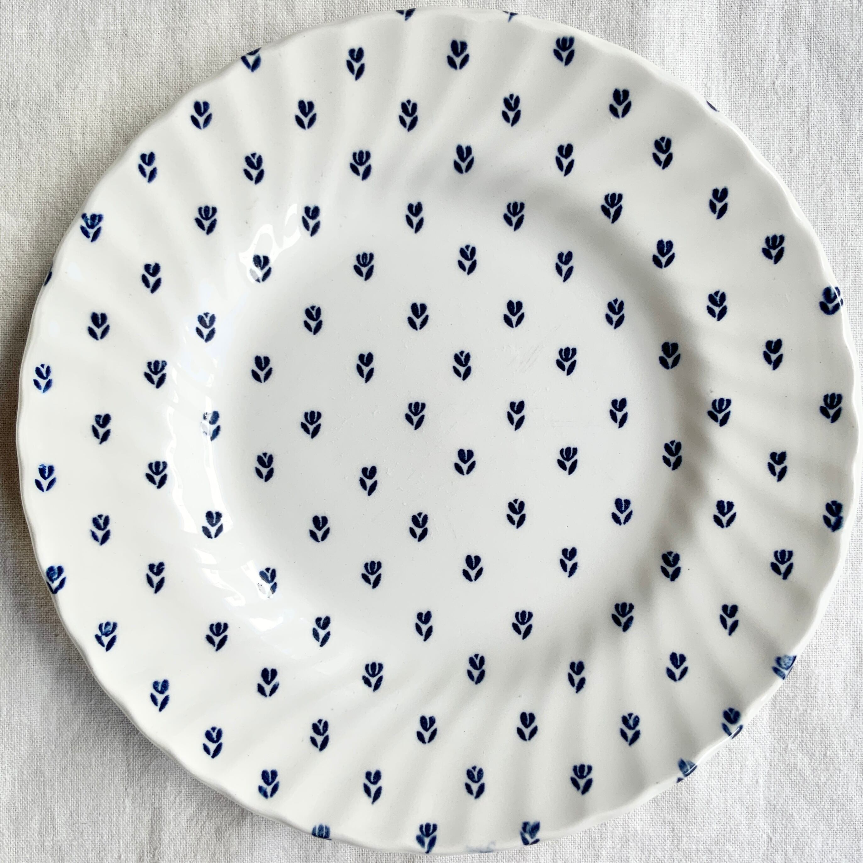 やわらかい白地に、ネイビーで小さなチューリップがドット柄のようにプレート全面に散りばめられています。