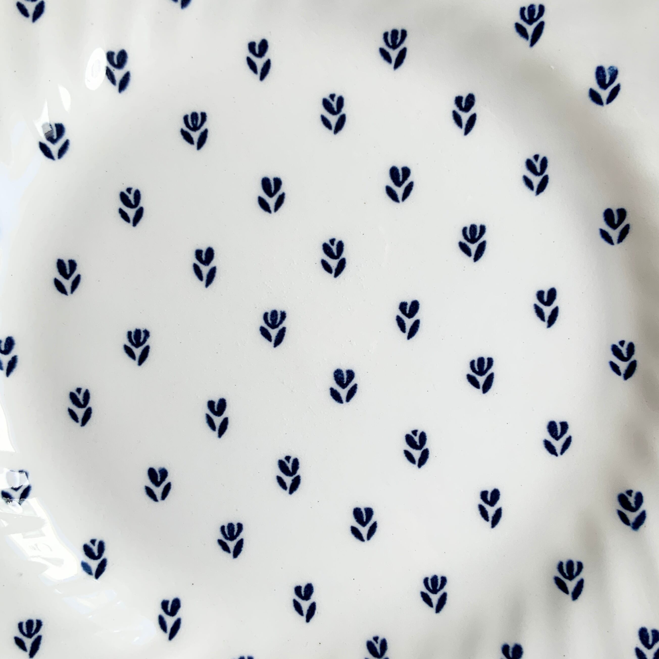 やわらかい白地に、ネイビーで小さなチューリップがドット柄のようにプレート全面に散りばめられています。