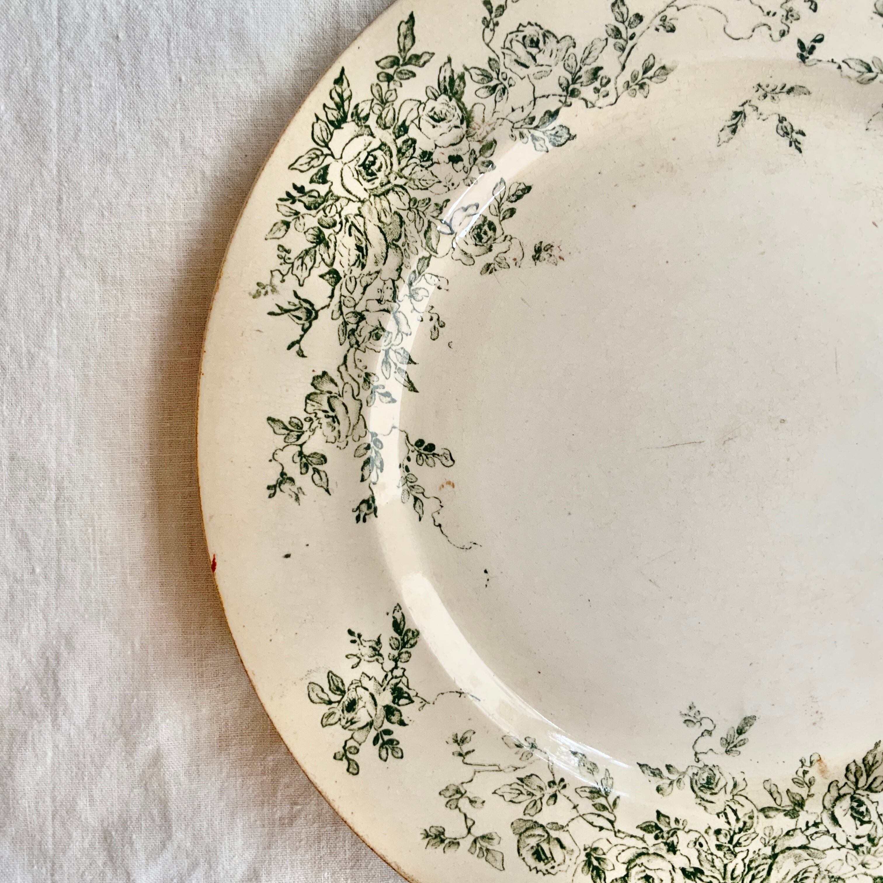 全体がしっとりと枯れた象牙色に、グリーンで繊細な野薔薇がプレートを囲うように美しく描かれています。