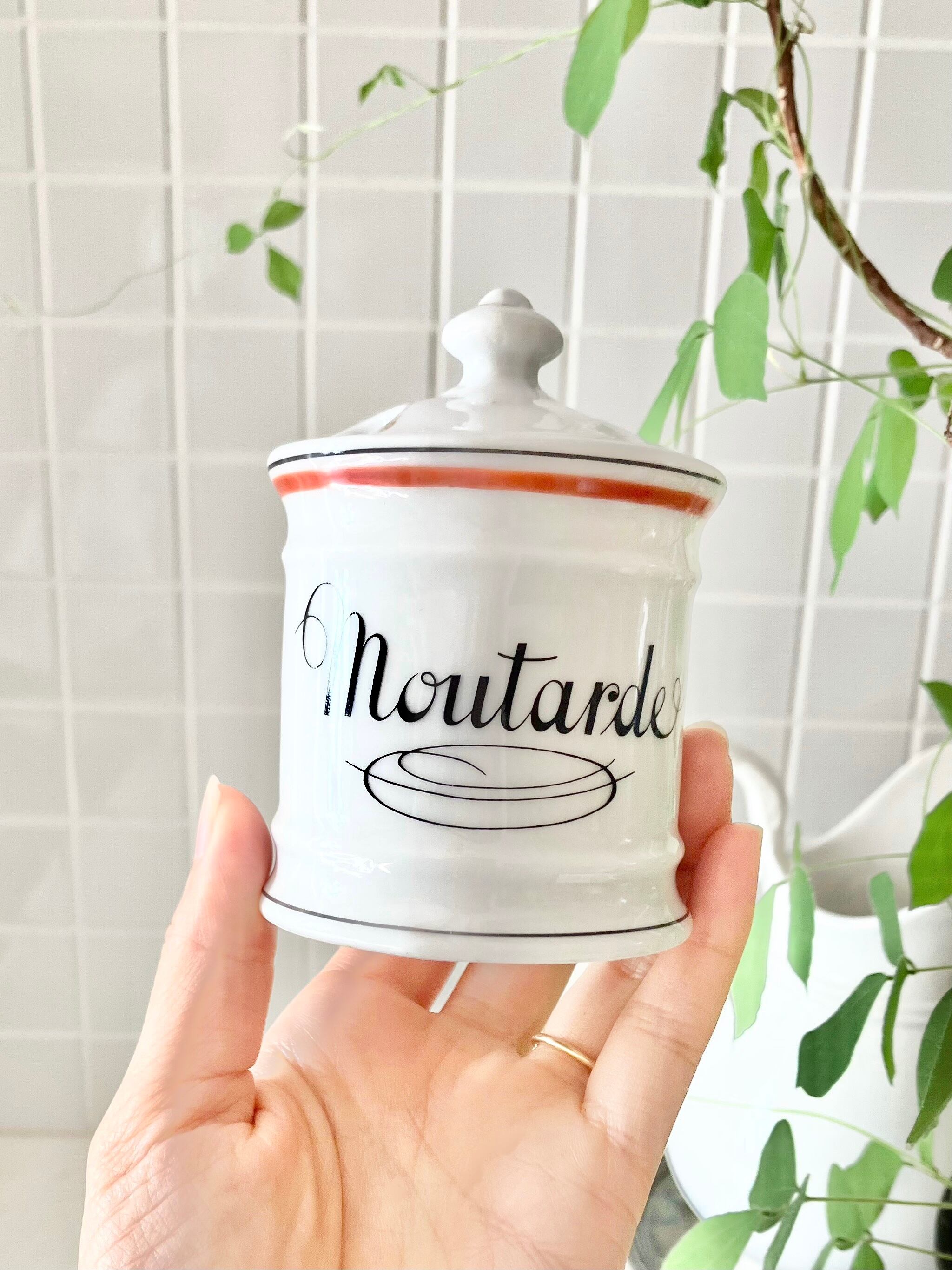 美しい白磁にオレンジのラインとフランス語のMoutardeの文字が描かれています。