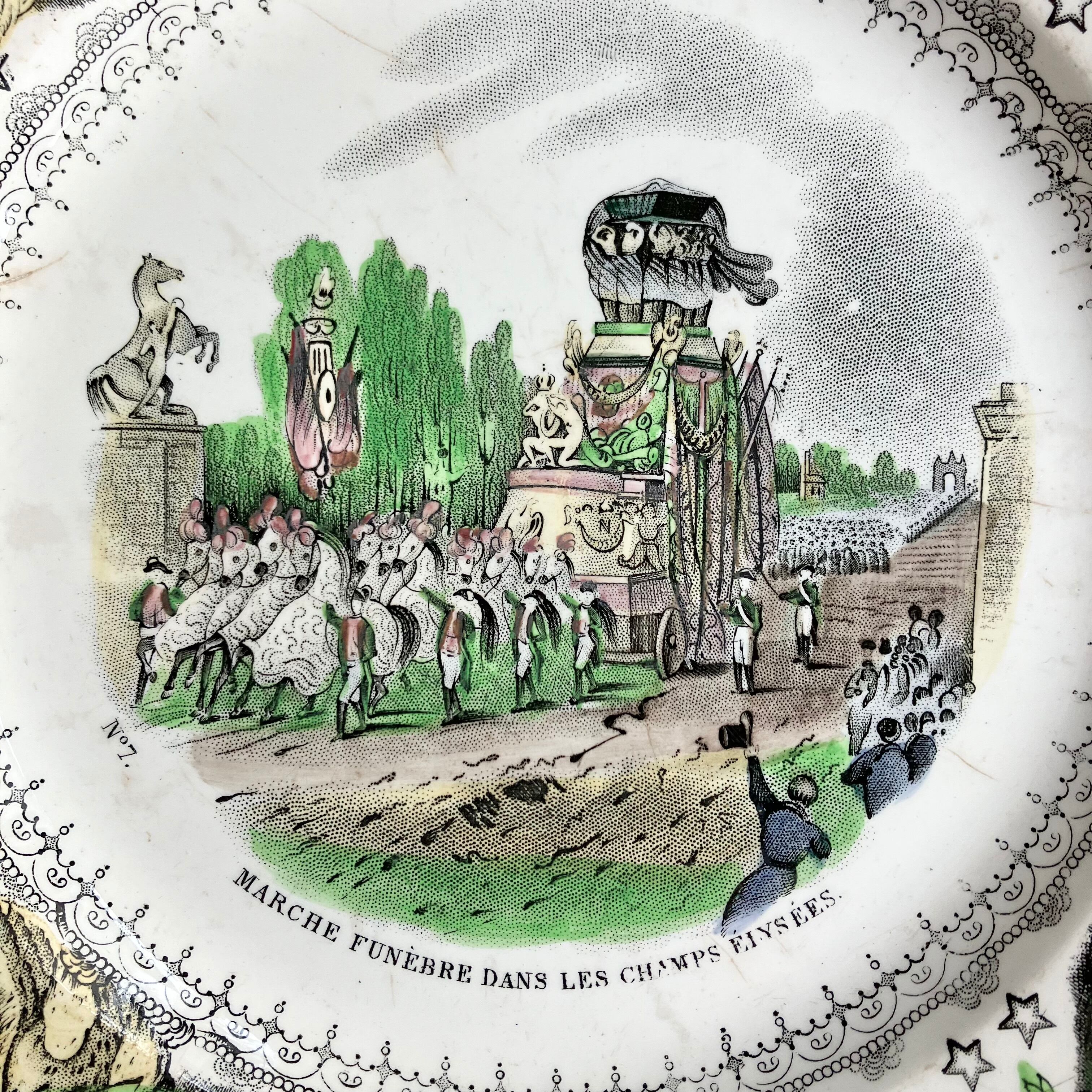 華やかなパレードの様子はもちろん、縁に描かれているナポレオンの象徴でもあった鷹や、グリーンのガーランドも素晴らしく、そのまわりに散りばめられた星(エトワール)とバラなどの細かな装飾も、とても美しい一枚です。