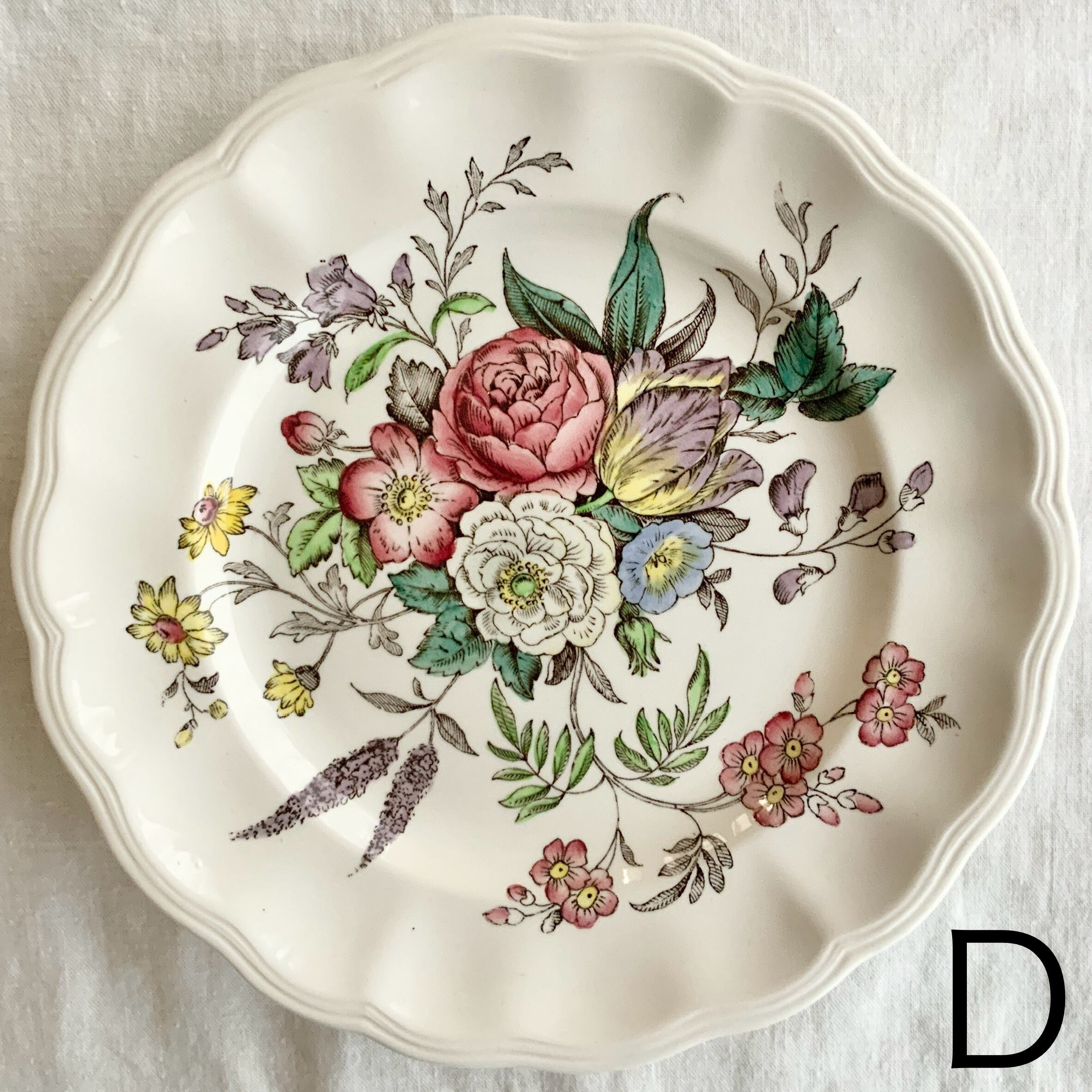 やわらかな乳白色に、バラやチューリップなどの美しい花束が描かれています。縁は愛らしいフラワーリムです。
