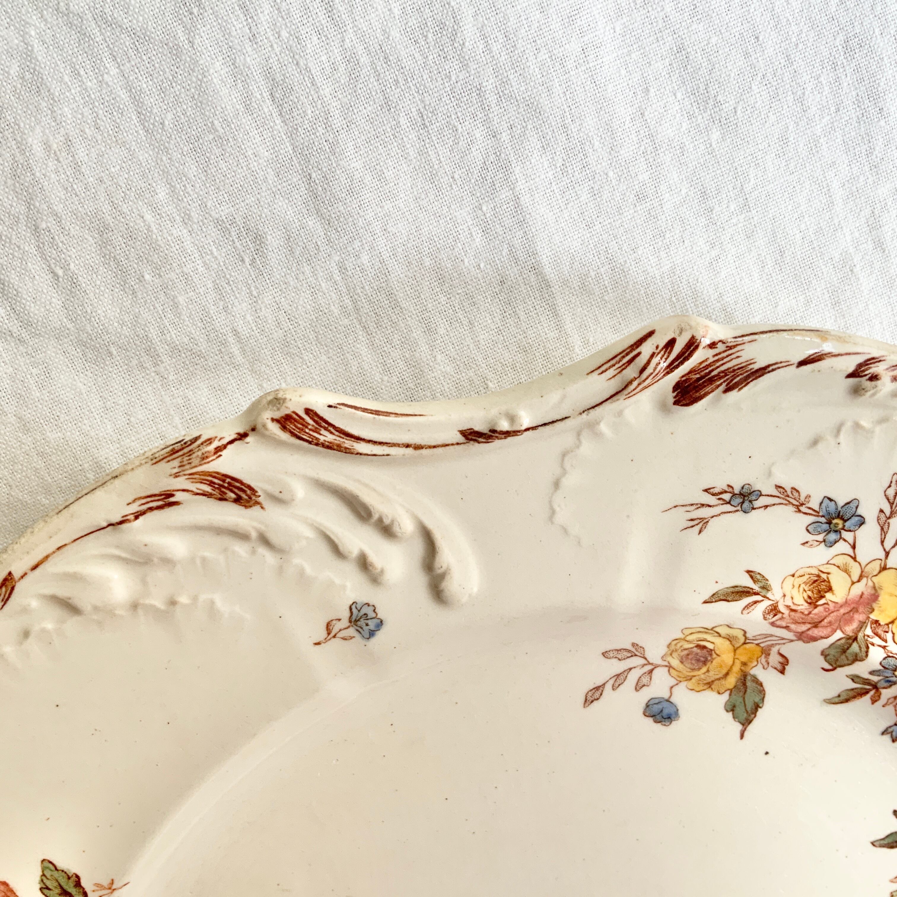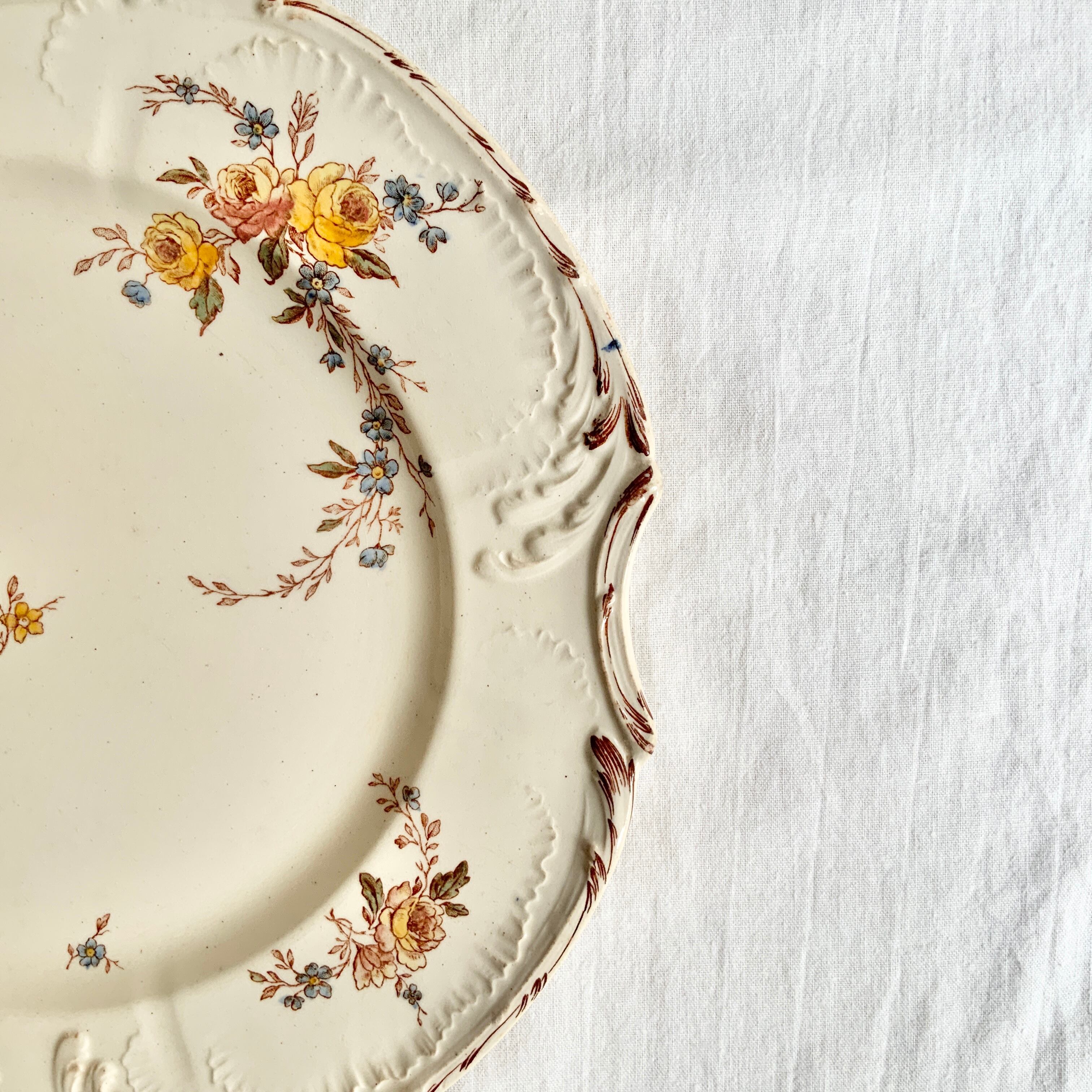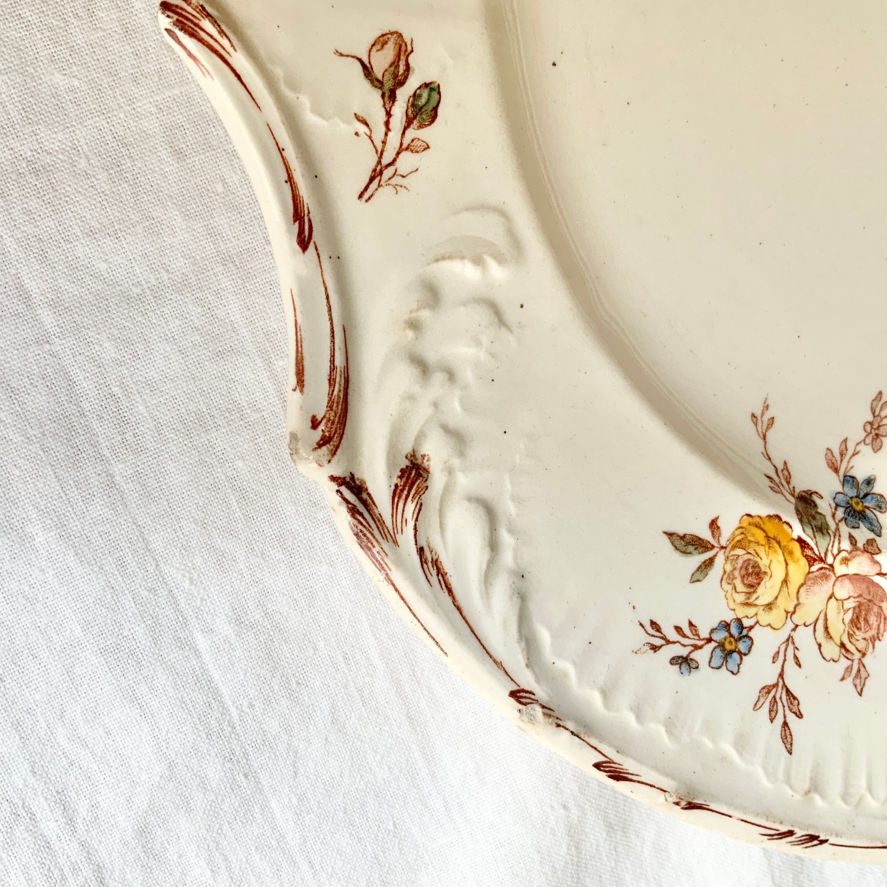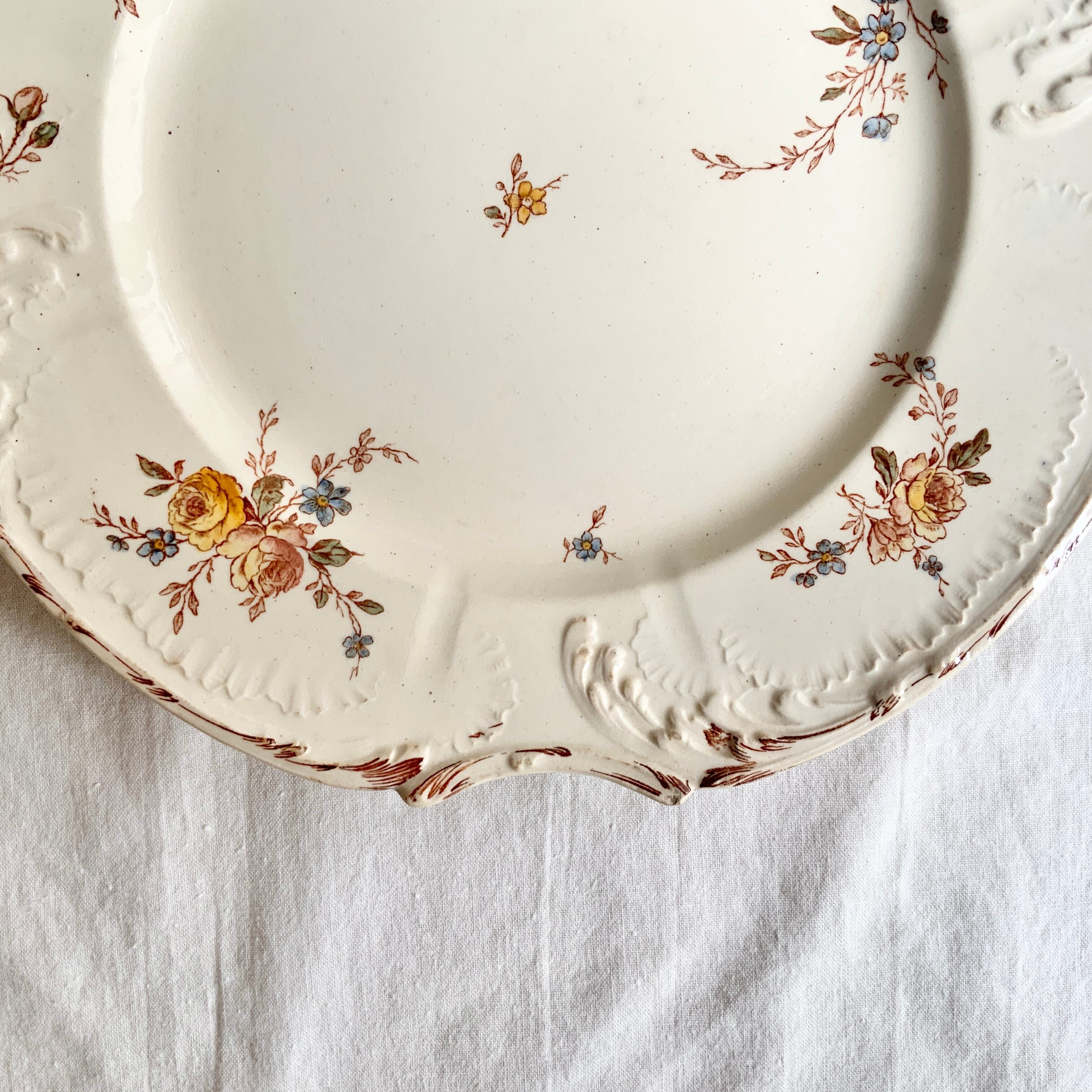 やわらかなクリーム色に、ブラウンでたくさんの可愛らしいバラや小花が散りばめられています。やさしい色味や縁の波打つレリーフ、ロカイユ装飾もとても美しく、大変珍しい一枚です。