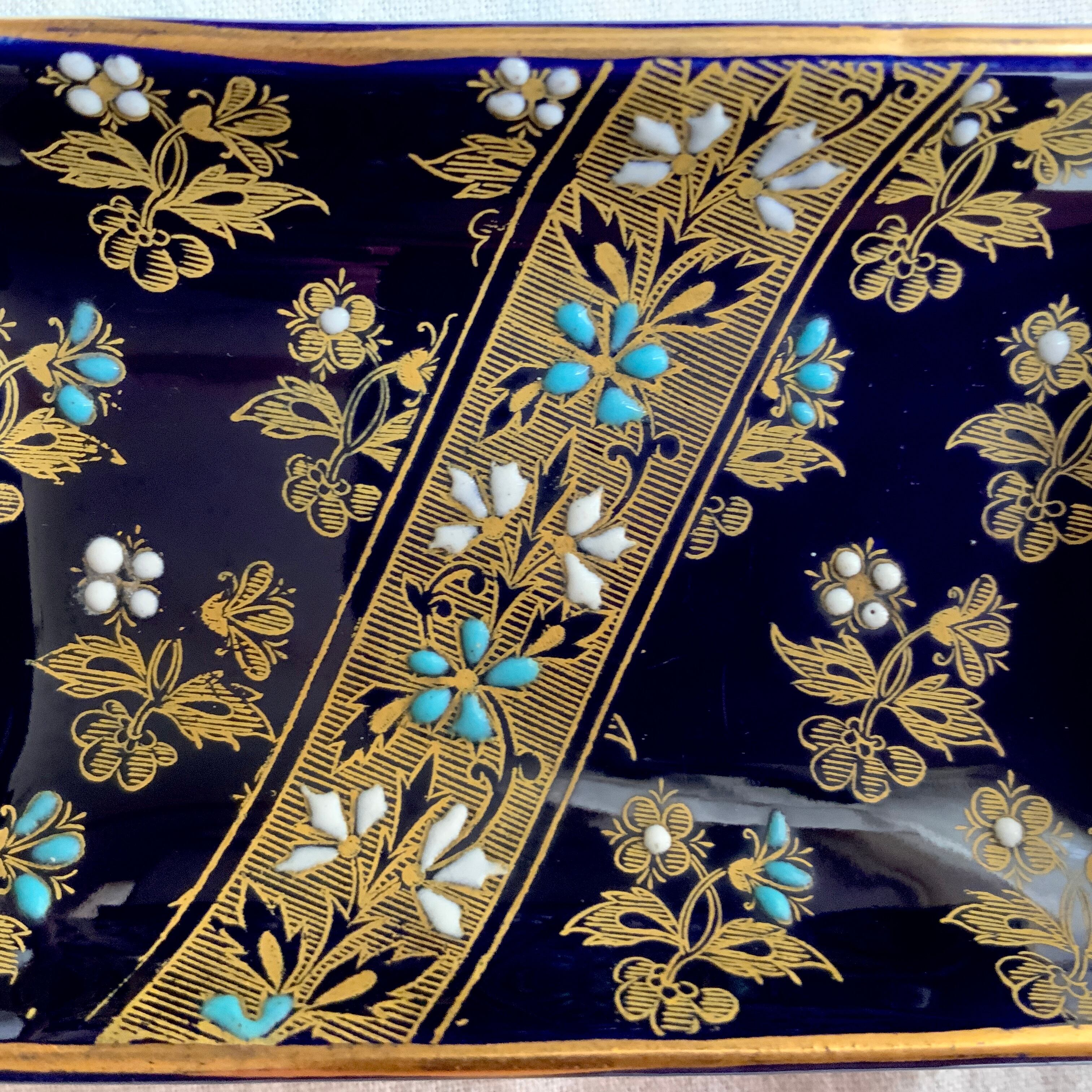 深い青色に金彩でたくさんの花が描かれ、花弁の箇所はエナメルでぷっくりと盛り上がっています。