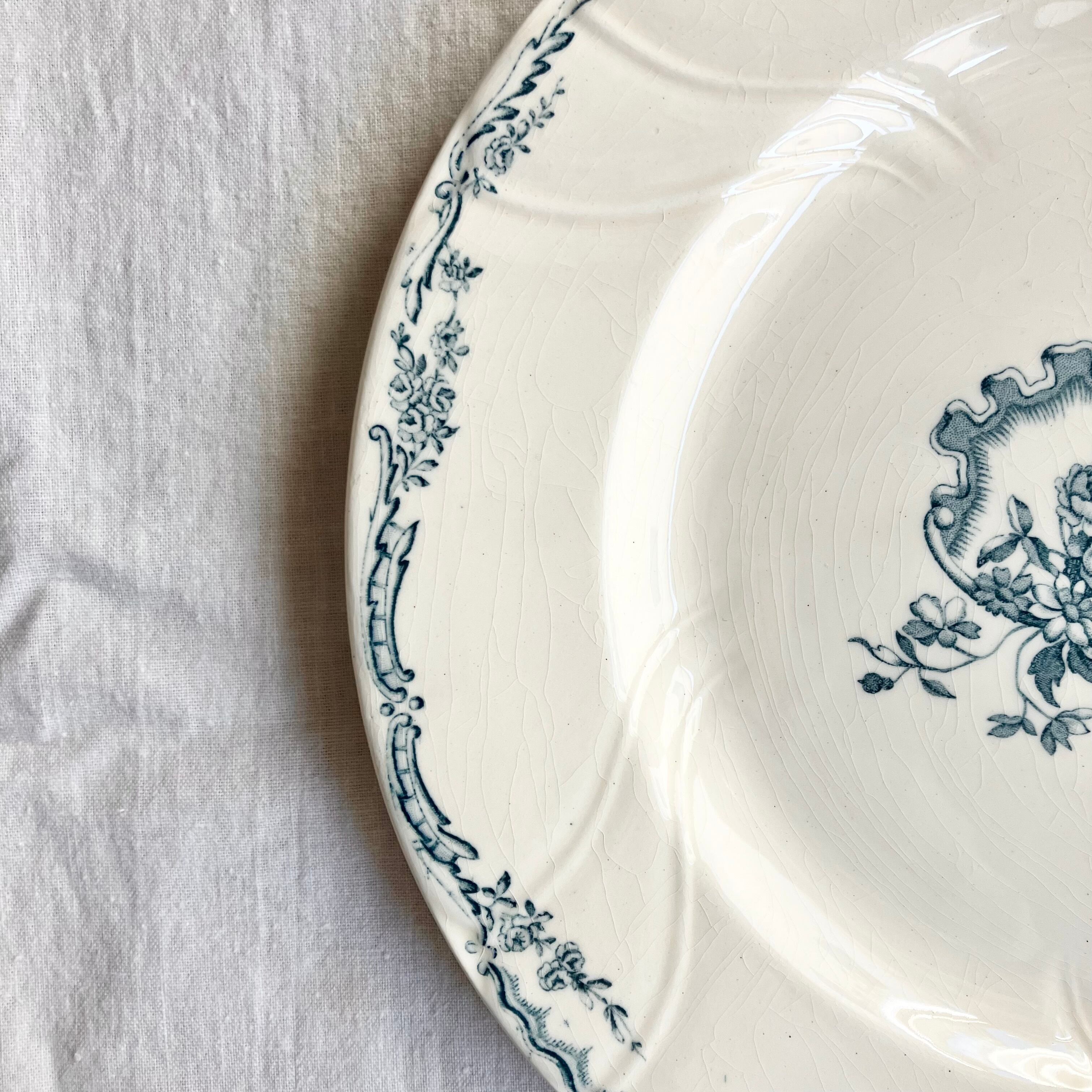 透明感のあるミルク色に、アンティークブルーでとても愛らしいバラが描かれています。そのまわりには美しいロカイユ。縁にもたくさんの小さなバラとロカイユが飾られ、そして緩やかな美しいウェーブのレリーフが施されています。