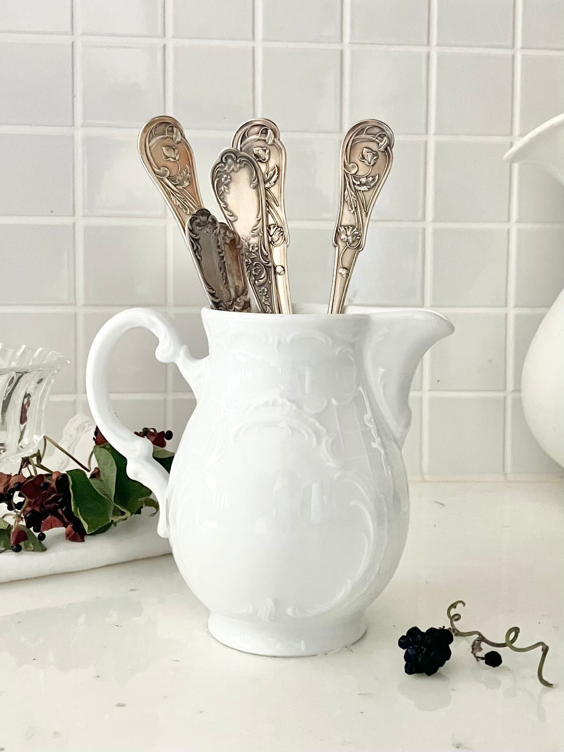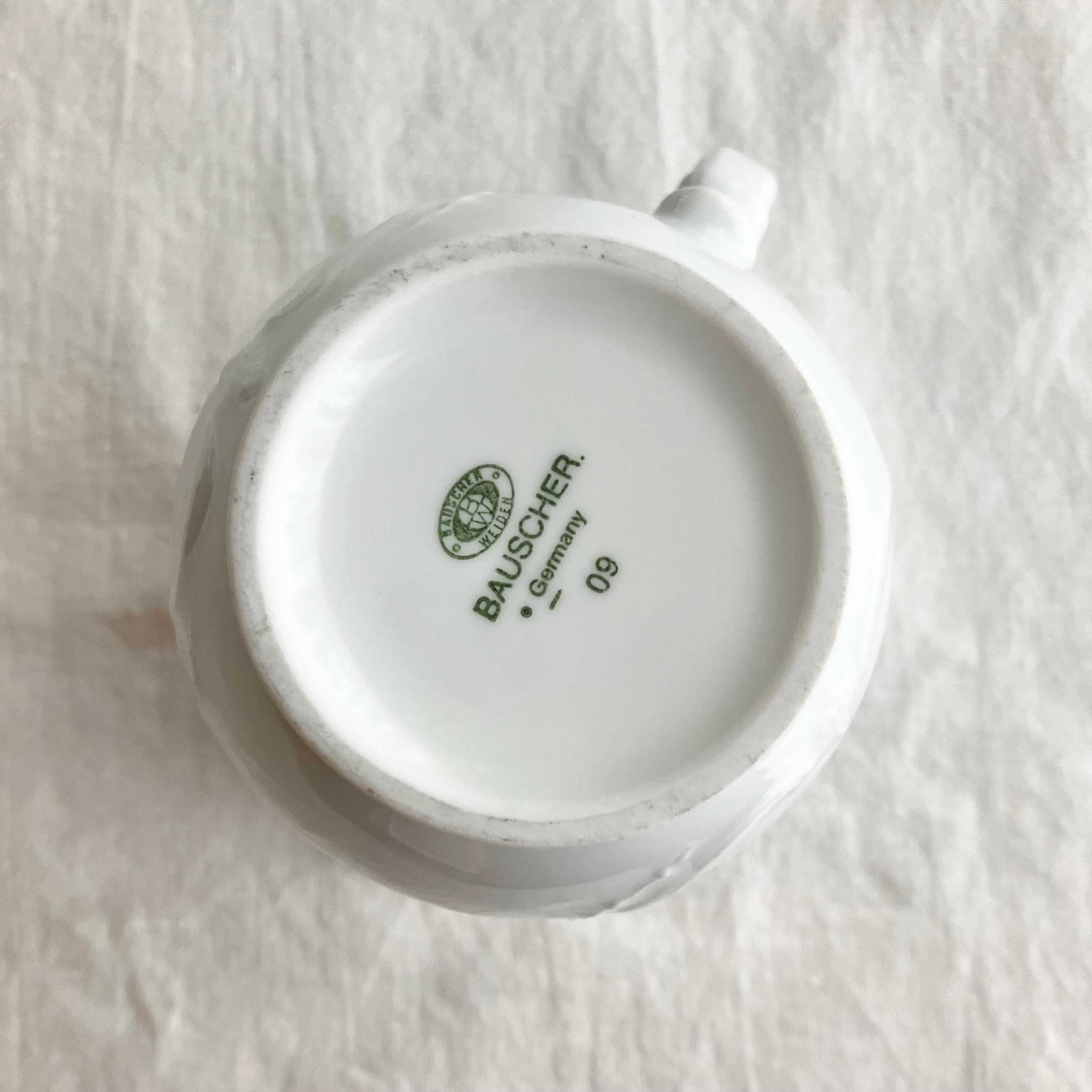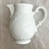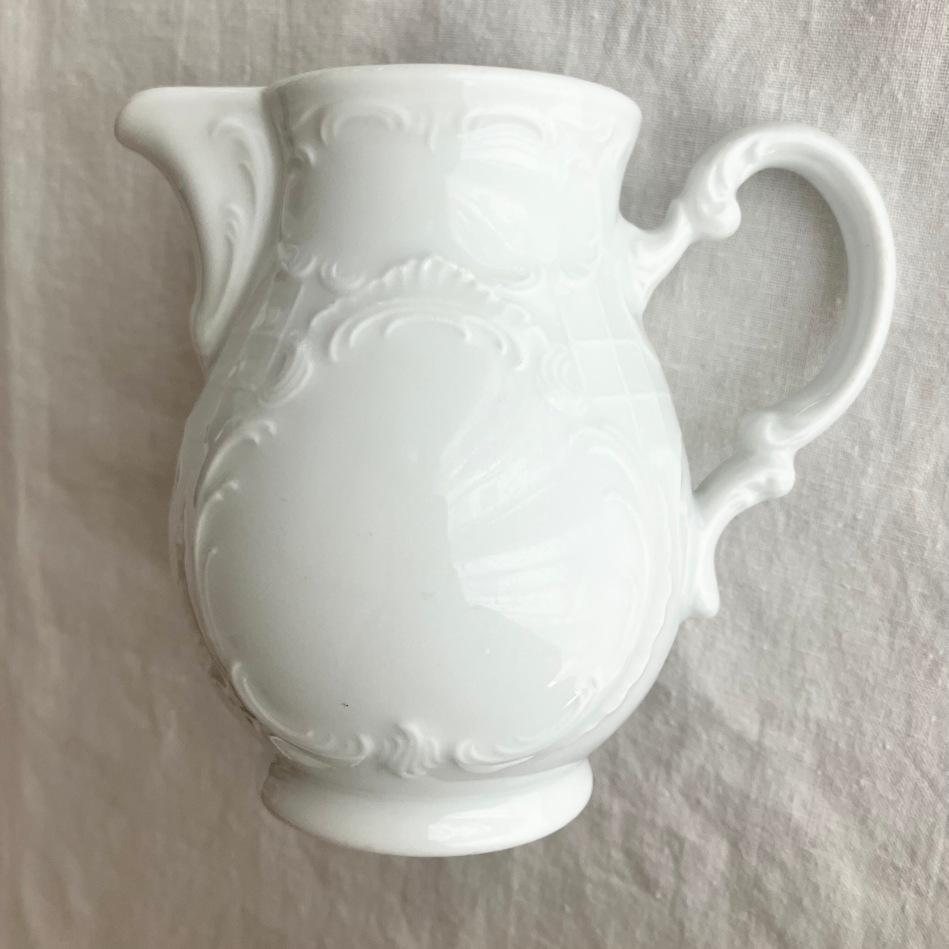 白地のぽってりしたボディに、美しいロカイユ装飾が施され、持ち手もロカイユになっています。