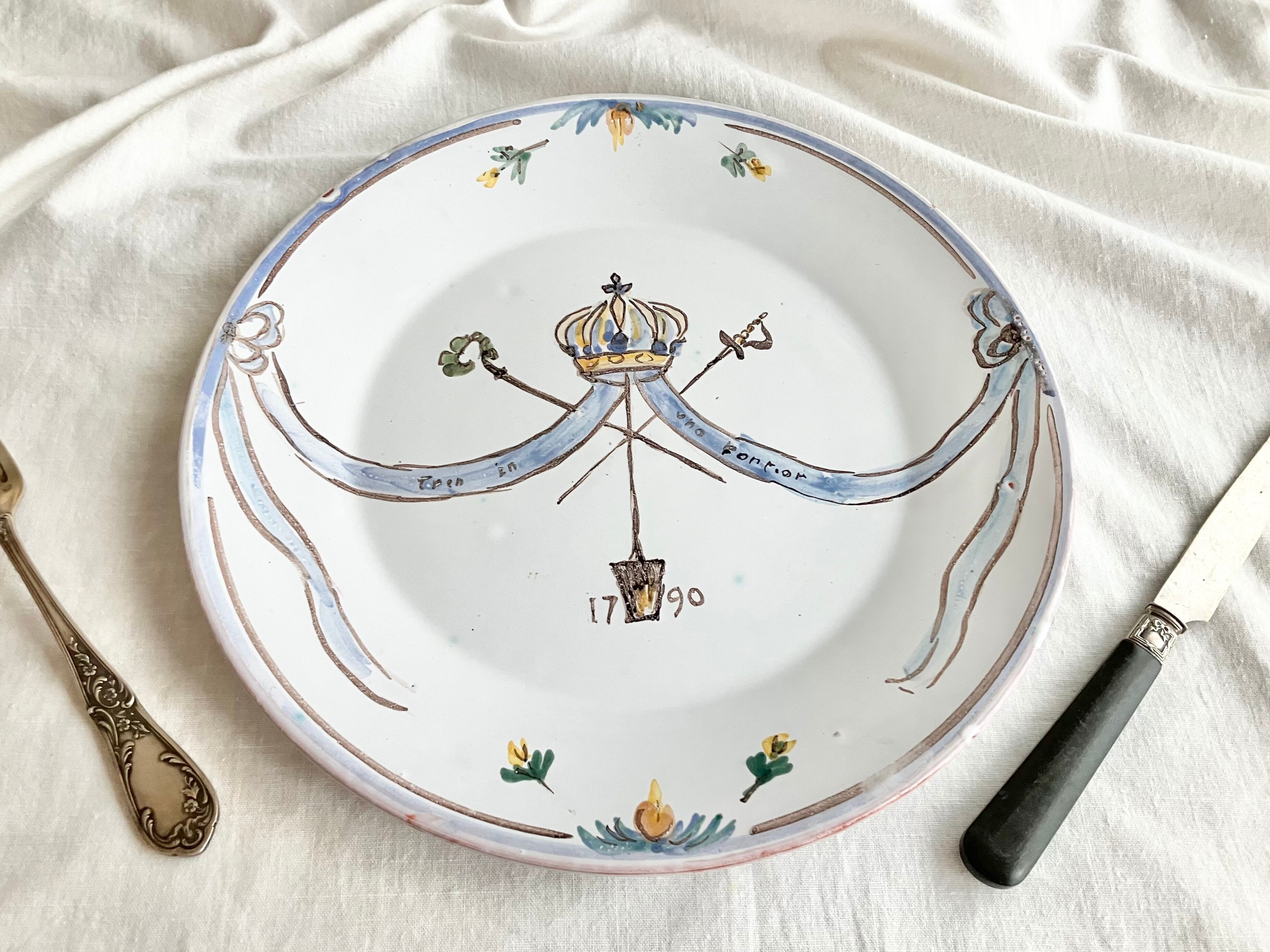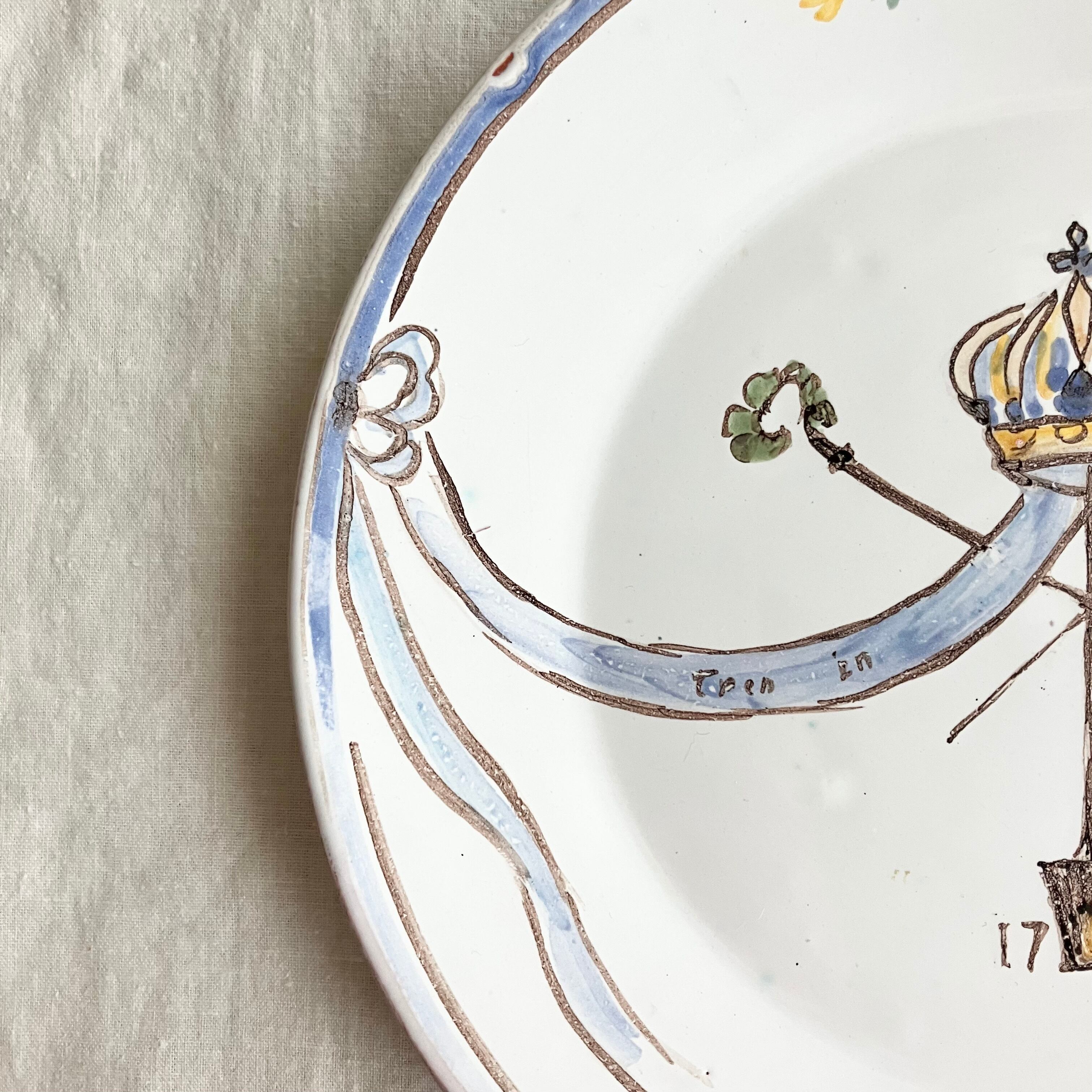 とろりとした白釉にやわらかいブルーやイエローで、フランス革命を示すシンボルが描かれています。