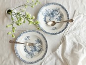 美しい白地に、深みのあるブルーでバラやチューリップなどの花々が