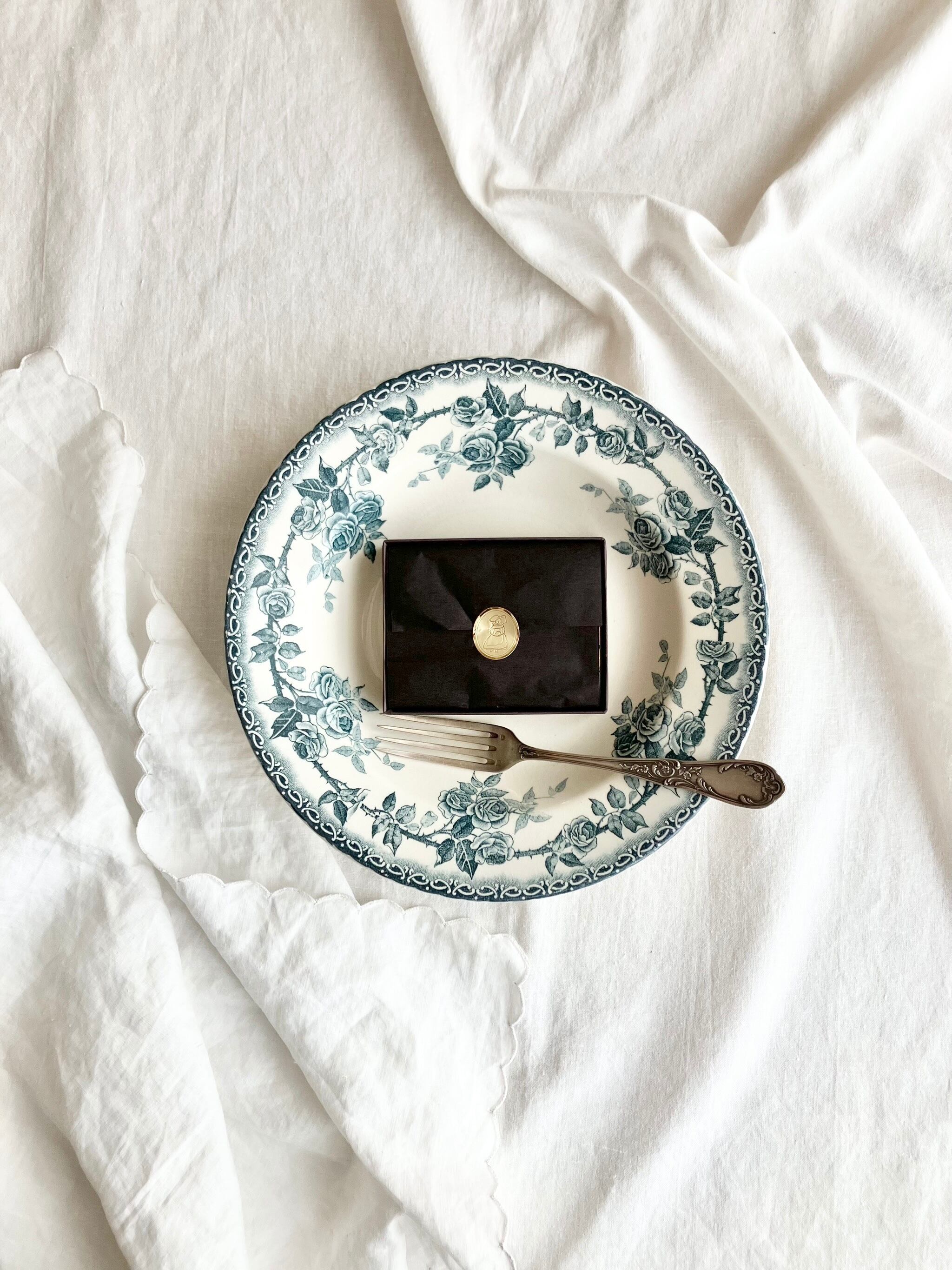 薄いクリーム色に深いグリーンで美しいバラのガーランドがぐるりと描かれています。